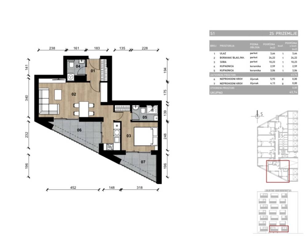 Zagreb, Bolnička, novogradnja na šest etaža s podzemnom garažom i vanjskim parkirnim mjestima.Stan S-1 dvosoban stan u prizemlju, zatvorene površine 43,74 m2.Sastoji se od: ulaznog hodnika, open space dnevnog boravka s blagovaonicom i kuhinjom, spavaće sobe i dvije kupaonice.Objekt je projektiran prema najsuvremenijim standardima gradnje; dok je čitava konstrukcija armirano - betonska. Ravni krov je neprohodni, izoliran hidroizolacijskim folijama nove generacije, te toplinskom izolacijom debljine 20 cm. Fasada je također izvedena u ETICS sustavu s toplinskom stiropor izolacijom debljine 15 cm, što u konačnici svrstava zgradu u A energetski razred.Pomno je biran svaki detalj, pa je tako vanjska stolarija u izvedbi aluminij - drvo s troslojnim staklom, sva rasvjeta u LED izvedbi, keramičke pločice su prve klase u sanitarnim čvorovima i terasama, a sva sanitarna oprema je visoke kvalitete poznatih svjetskih proizvođača.Dnevni boravci opremljeni su zidnim klima uređajima, dok je grijanje i topla voda preko kondenzacijskih bojlera.Zgrada je opremljena dizalom, zelene su površine hortikulturno uređene s odvojenim prostorom za smještaj kanti za otpad.Odlična lokacija, blizina javnog prijevoza, ljekarne, trgovina, restorana, veterinara, centra za ljepotu i ostalih sadržaja.Za sva dodatna pitanja stojimo na raspolaganju.... Više na eurovilla.hr, ID: 344390