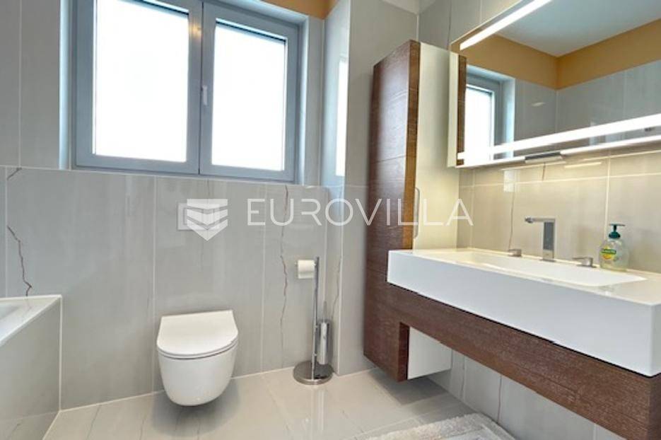 Babonićeva ulica, elitno novije građeno naselje (2008). Izuzetno mirna ulica, smještena u srcu Šalate, nekoliko min automobilom do glavnog gradskog trga. Kompleks se sastoji od 6 luksuznih vila (za ambasade) i 25 urbanih vila s oko 120 stanova. Cijeli kompleks je "high tech" izvedbe (inteligentne kuće, alarmi, video nadzor naselja, te jedan bazenski kompleks s popratnim sadržajima).Četverosoban penthouse prostranim terasama, garažom za 2 automobila i 2 parkirna mjesta, ukupno neto korisne površine 195m2.Sastoji se od: ulaznog hodnika, prostranog dnevnog boravka s blagovaonicom 55m2, kuhinje s ostavom, terasa, master spavaće sobe s kupaonicom, garderobom i terasom, 2 dječje spavaće sobe s kupaonicom, vešeraja.U stan se ulazi direktno liftom te postoje još jedna sigurnosna protuprovalna vrata. Etažno plinsko grijanje, klimatizirane sve prostorije, pametna kuća (centralno reguliranje rasvjete i roleta), centralni usisivač.U potpunosti renoviran 2022 god, novi parketi, nove kupaonice. Veći dio stana je namješten i opremljen.Ostale informacije na upit.... Više na eurovilla.hr, ID: 433883