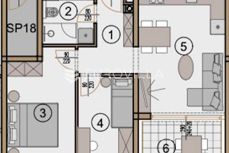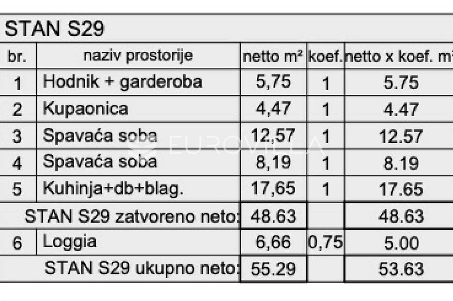 NOVOGRADNJA U PULI - MODERNA STAMBENA ZGRADA NA ATRAKTIVNOJ LOKACIJINa jednoj od najpoželjnijih lokacija u Puli smještena je ova suvremena stambena zgrada, osmišljena prema potrebama modernih obitelji.Zgrada se prostire na sedam etaža i sadrži 87 funkcionalnih stanova, veličine od 47 m² do 55 m². Svakom stanu pripada spremište i parkirno mjesto.Stan S29 nalazi se na drugom katu i ima neto korisnu površinu od 55.33 m². Sastoji se od: hodnika, kuhinje s dnevnim boravkom, kupaonice, dvije spavaće sobe, loggie te spremište SPR 18; što čini ukupnu neto površinu. Uz stan dolazi i natkriveno parkirno mjesto 33 - sve je uključeno u cijenu.Visoka kvaliteta gradnje i opreme: protuprovalna ulazna vrata, električno podno grijanje u kupaonici, Ariston Velis bojler, inverter klima uređaj, podne obloge: keramika i laminat, bijela sobna vrata.Funkcionalnost i udobnost prostora.Zgrada ima dva ulaza, dva stubišta i dva lifta, čime je osigurana bolja protočnost i jednostavniji pristup stanovima.Izvrsna lokacija.Svi važni sadržaji nalaze se u neposrednoj blizini - trgovački centri, bolnica, škole, vrtići, dok su prekrasne plaže Verudele udaljene samo 2 km.Završetak radova planiran je za 06/2026.Cijena je iskazana s uključenim PDV-om.Za dodatne informacije i razgled nekretnine, slobodno nas kontaktirajte.... Više na eurovilla.hr, ID: 530233