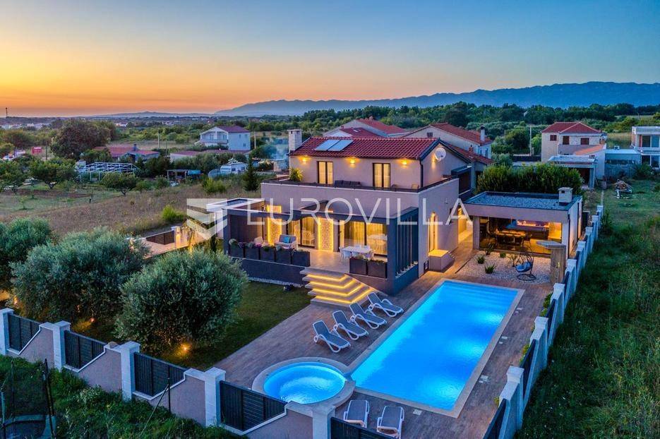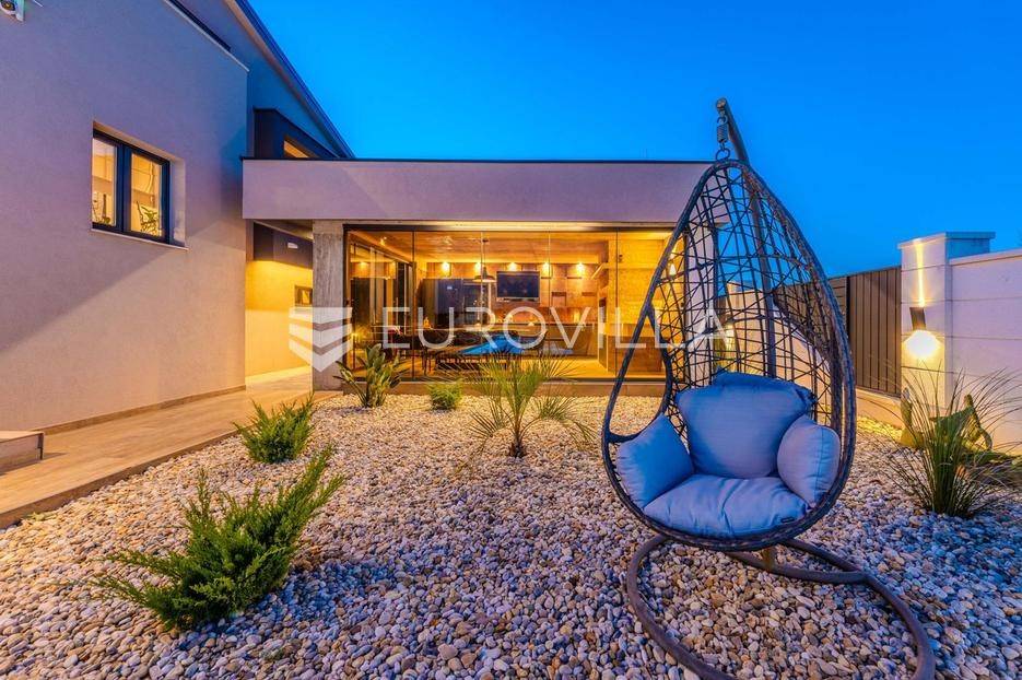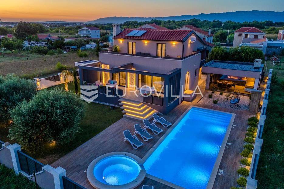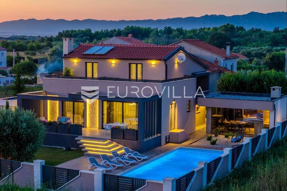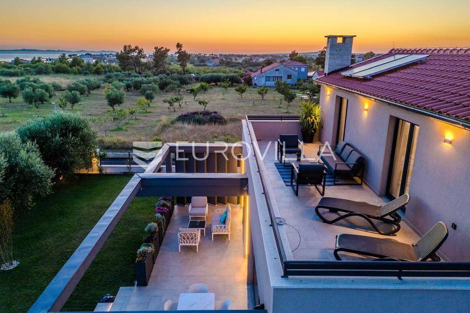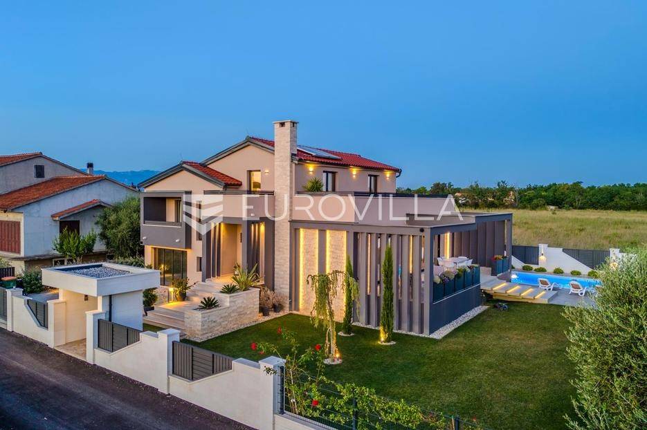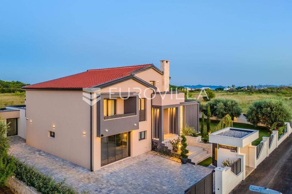Zadar, Privlaka, moderna kuća smještena na mirnoj lokaciji, nalazi se na zemljištu površine 913 m2.Kuća se prostire na tri etaže, ima četiri spavaće sobe te pet kupaonica.Na prvoj etaži nalazi se prostor predviđen za teretanu te prostorija za odmor i opuštanje.Na drugoj etaži nalazi se prostrani dnevni boravak, kuhinja i blagovaonica s izlazom na terasu.U dvorištu kuće nalazi se bazen, sunčalište te prekrasna ljetna kuhinja, idealno za opuštanje i uživanje u mirnom okruženju i prekrasno uređenom vrtu.Kuća je kompletno te moderno opremljena visokokvalitetnim namještajem i opremom ( podno grijanje, dizalica topline, videonadzor, bušotina te sustav navodnjavanja).Ova prostrana kuća savršen je spoj luksuza, udobnosti i prirodne ljepote.Uredno vlasništvo.Više informacija na upit.... Više na eurovilla.hr, ID: 591906