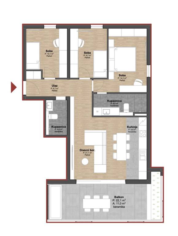 Split - Podstrana | Stambena zgrada s devet modernih stambenih jedinica - drugi red od mora.Na prodaju je atraktivna stambena zgrada s ukupno devet stambenih jedinica, smještena na iznimno poželjnoj lokaciji u drugom redu od mora u Podstrani.Projekt je osmišljen i bit će izveden prema najvišim građevinskim standardima, uz pažljivo birane materijale i suvremena tehnička rješenja koja osiguravaju udobnost, sigurnost i visoku kvalitetu stanovanja.Iznimna lokacija omogućuje da svaki stan i svaka etaža uživaju u otvorenom i trajno nesmetanom pogledu na more.A - S1 | Trosoban stan na prvom katuStan se sastoji od ulaznog hodnika, tri spavaće sobe (od kojih jedna ima vlastitu kupaonicu), zajedničke kupaonice, kuhinje s blagovaonicom i dnevnog boravka.Stambena površina iznosi 78,35 m².Dnevni boravak ima izlaz na natkriveni balkon površine 22,08 m².Ukupna neto površina stana s garažnim mjestima iznosi 104, 39 m².U cijenu su uključena dva garažna parkirna mjesta.Mikrolokacija je iznimna - svega nekoliko koraka do mora, uređenih plaža i nove šetnice koja povezuje cijelu Podstranu, kao i blizina svih potrebnih sadržaja (javni prijevoz, trgovine, restorani, kafići i dr.).Za sve dodatne informacije stojimo Vam na raspolaganju.... Više na eurovilla.hr, ID: 598841