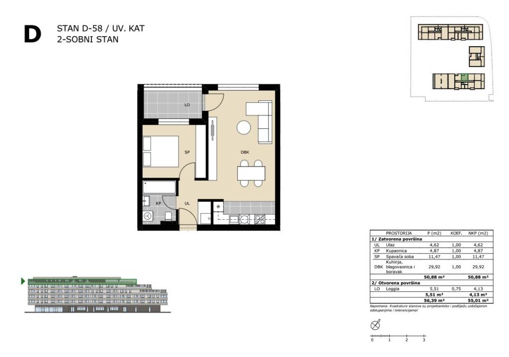Dvosoban stan na 5. katu stambene zgrade zatvorene površine 50,88 m2 s loggijom 5,51 m2 (4,13 m2), ukupne neto površine 55,01 m2.Stan D-58 sastoji se od ulaza, kupaonice, spavaće sobe, kuhinje s blagovaonicom te dnevnog boravka.Obvezna kupnja spremišta, vanjskog ili garažnog parkirnog mjesta.Stan se nalazi u višestambenoj zgradi unutar kompleksa koji će se sastojati od 165 stambenih jedinica.Green Side Residence nalazi se u Velikoj Gorici, samo 10 kilometara od Zagreba i tek 3 kilometra od Međunarodne zračne luke Zagreb, lokacija nudi izvrsnu prometnu povezanost s glavnim gradom i cijelom Hrvatskom, zahvaljujući neposrednom pristupu dvjema autocestama.Okružen zelenilom, a opet u blizini svih gradskih sadržaja, ovaj projekt predstavlja idealan izbor za miran, ali povezan život.Useljenje 11/2027. godine.Za sve ostale informacije stojimo na raspolaganju.... Više na eurovilla.hr, ID: 645785