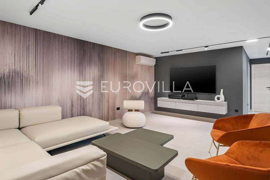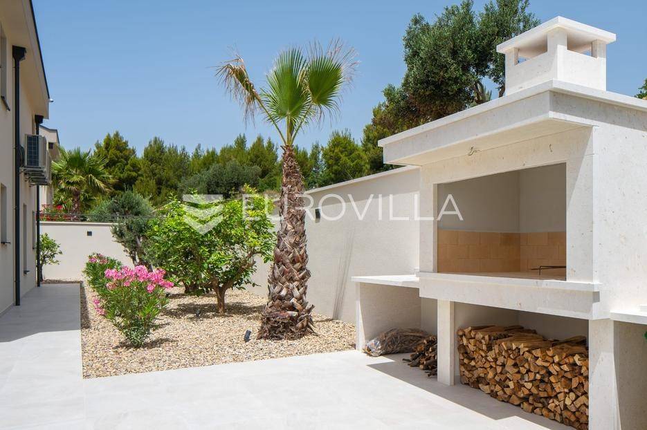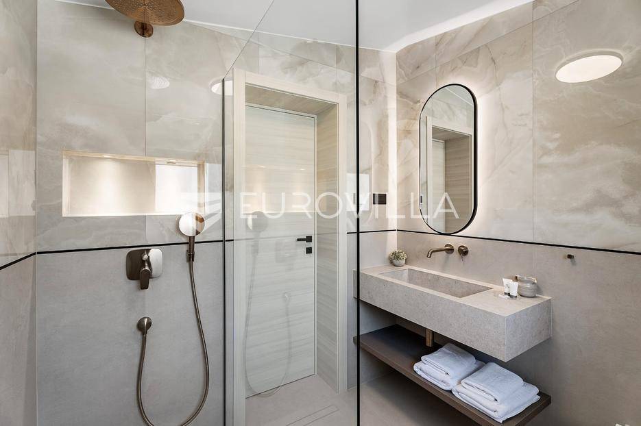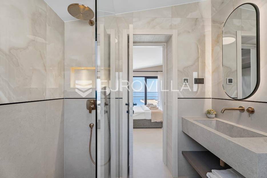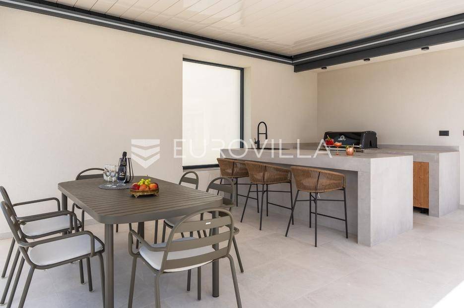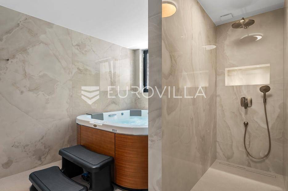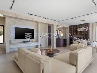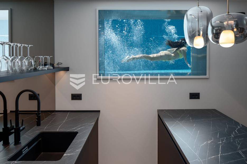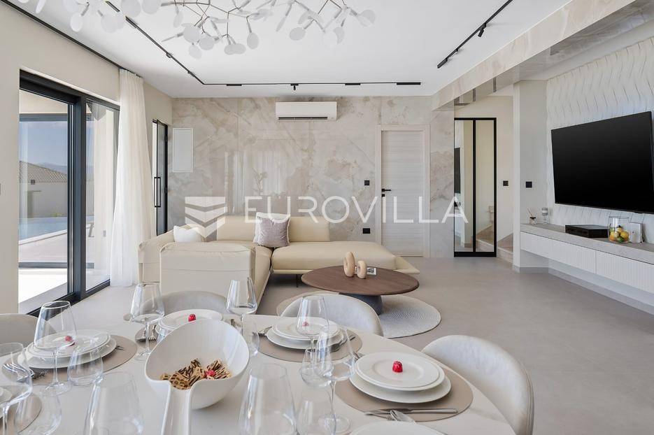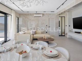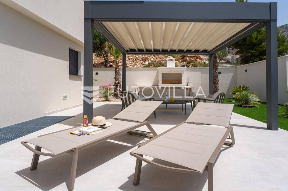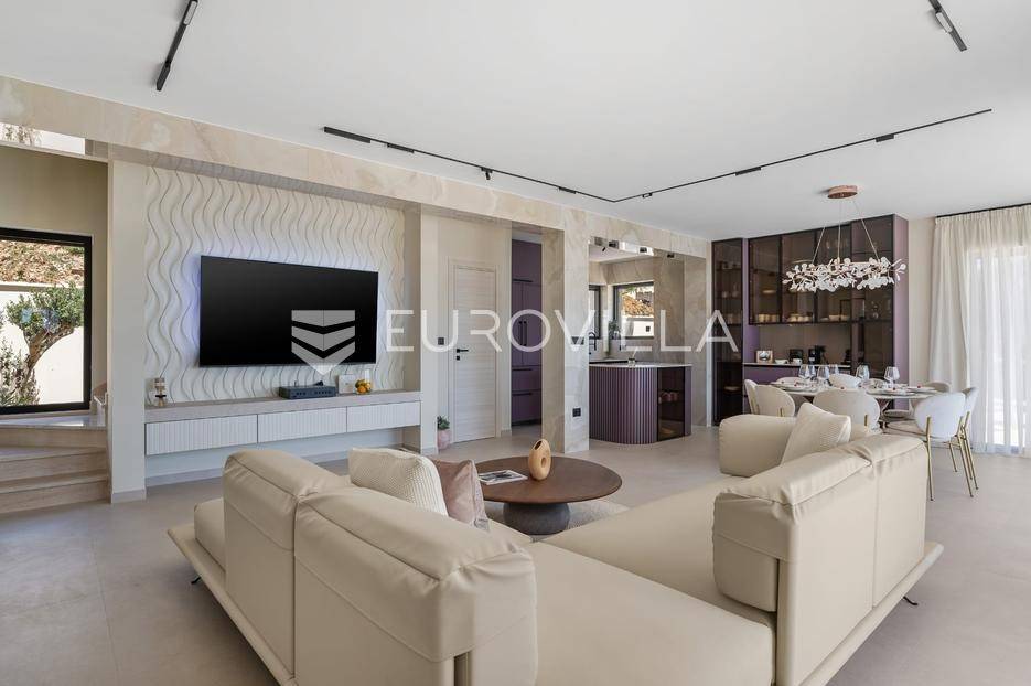 Split-Podstrana, elegantna luksuzna vila s garažom, bazenom i panoramskim pogledom na more.Vila s bazenom modernog dizajna, visokog standarda i stupnja opremljenosti, smještena na uzvisini s prekrasnim panoramskim pogledom na more. Bruto površina kuće od 328 m², smještena je na parceli veličine 620 m² koja se nalazi na 300 m od mora.Proteže se na tri etaže, posjeduje četiri sobe sa kupanicama, preljevni bazen sa sunčalištem, natkrivenu ljetnu kuhinju, garažu za dva automobila te dodatnu ostavu i strojarnicu.Ispred kuće je ograđen prilaz s parkingom za tri automobila.Sastoji se od: podrumskog-suterenskog djela u kojem je garaža za dva automobila, velike prostorije za druženje - fan room (49 m²) s mini kuhinjom, saune s kupaonicom i tehničke sobe. Visokog prizemlja s prostranim dnevnim boravkom s kuhinjom i blagovaonicom, spavaće sobe s kupaonicom, a ispred je velika djelomično natkrivena terasa. Vani ispred dnevnog boravka je sunčalište s grijanim bazenom. Na prvom katu su tri luksuzne sobe, svaka s vlastitom kupaonicom i izlazom na lođu, sve orijentirane na jug s prekrasnim panoramskim pogledom.Prizemlje se sastoji od: prostranog dnevnog boravka otvorenog tipa s blagovaonicom, kuhinjom i ostavom (59,6 m²), jedna spavaća soba s kupaonicom, a ispred su dvije velike djelomično natkrivene terase u jednoj je ljetna kuhinja, a ispred je sunčalište s grijanim preljevnim bazenom te ostavom kao tehničkom sobom.Na prvom katu nalaze se tri prostrane komforne spavaće sobe s vlastitim kupaonicom te prostranom lođom, sve na južnoj strani tako da se iz istih pruža prekrasan panoramski pogled na more.Vanjski bazen 36 m², masažni slap, grijanje vode toplinskom pumpom, filtriranje vode je elektrolizom.Visoka energetska učinkovitost A+ osigurana je fasadom debljine 10 cm izvana te iznutra kamenom vunom 6 cm, pregradni zidovi unutar objekta su knauf ploče i akustična vuna što osigurava vrhunsku zvučnu izolaciju. Na krovu su smješteni solarni sistem za toplu vodu, centralni usisivač, staklo s pogledom u bazen iz fun sobe, stepenište unutar objekta je kamen uz integriranu led rasvjetu uz ogradu os stakla koja naglašava eleganciju i luksuz.Svi zavori su zatvori antracit aluminijski, troslojna stakla, automatizirane rolete, visokokvalitetni kamen u objektu i izvan njega, ograda oko objekta, oluci u fasadi,....Vila se nalazi na mirnoj lokaciji, odlična atmosfera i luksuzno opremljena kuća za odmor idealna su kombinacija za ugodan odmor.Podstrana je turističko mjesto od Splita glavnog grada Dalmacije udaljeno 7 km, a od zračne luke Split 28 km. U Podstrani su svi sadržaji potrebni za ugodan odmor te za svakodnevni život: trgovine, restorani, ljekarna, škola, igralište,... Pješčane i šljunčane plaže protežu se od Stobreča pa sve do Omiša a povezane su šetnicom uz more.Novoizgrađena kuća, potpuno namještena i opremljen spreman za useljenje.Za sve dodatne informacije stojim Vam na raspolaganju... Više na eurovilla.hr, ID: 663136