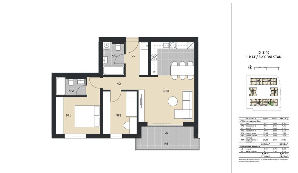 Trosoban stan na 1. katu stambene zgrade zatvorene površine 69,28 m2 s loggiom 4,40 m2 (3,30 m2) i natkrivenim balkonom 4,27 m2 (2,14 m2), ukupne neto površine 74,72 m2.Stan D-10 sastoji se od ulaznog hodnika, kuhinje s blagovaonicom i dnevnim boravkom, dvije spavaće sobe, dvije kupaonice i loggie/natkrivenog balkona.Obvezna kupnja spremišta, vanjskog ili garažnog parkirnog mjesta.Stan se nalazi u višestambenoj zgradi unutar kompleksa koji će se sastojati od 165 stambenih jedinica.Green Side Residence nalazi se u Velikoj Gorici, samo 10 kilometara od Zagreba i tek 3 kilometra od Međunarodne zračne luke Zagreb, lokacija nudi izvrsnu prometnu povezanost s glavnim gradom i cijelom Hrvatskom, zahvaljujući neposrednom pristupu dvjema autocestama.Okružen zelenilom, a opet u blizini svih gradskih sadržaja, ovaj projekt predstavlja idealan izbor za miran, ali povezan život.Useljenje 11/2027. godine.Za sve ostale informacije stojimo na raspolaganju.... Više na eurovilla.hr, ID: 695036