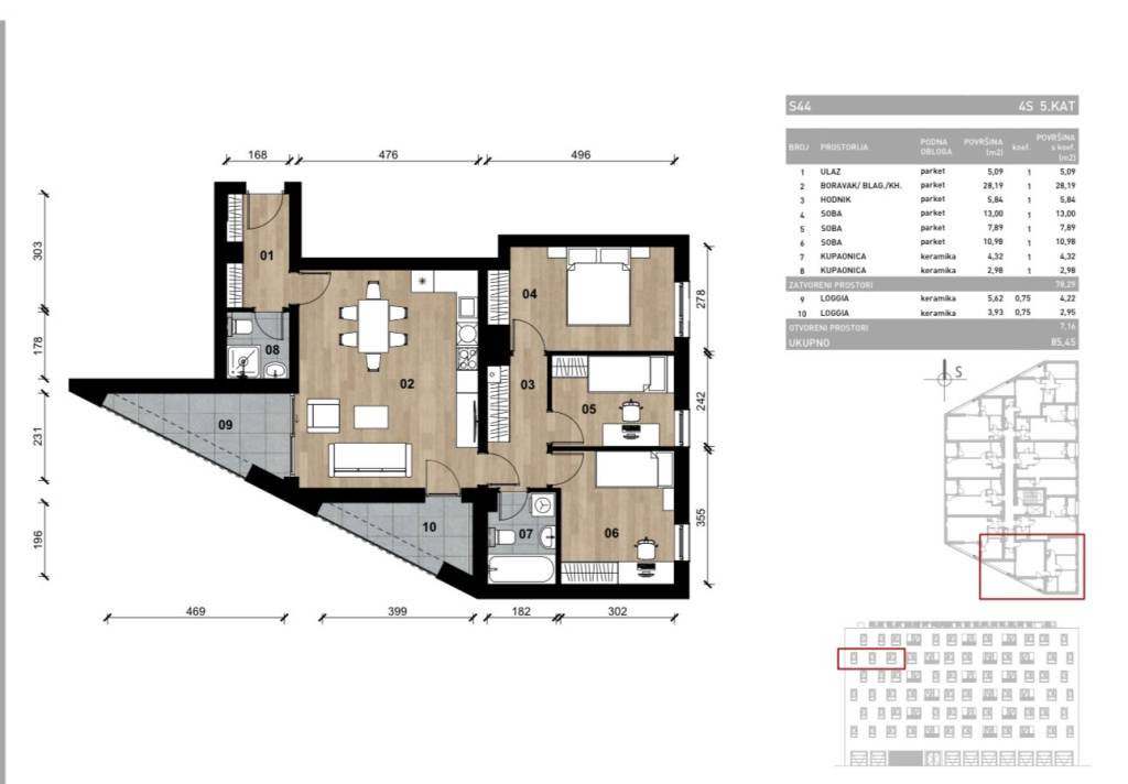 Zagreb, Vrapče, novogradnja na šest etaža s podzemnom garažom i vanjskim parkirnim mjestima.Stan S-44 četverosoban stan na petom katu, unutrašnje površine 78,29 m2.Sastoji se od: ulaza, open space dnevnog boravka s blagovaonicom i kuhinjom, hodnika, tri spavaće sobe, dvije kupaonice i dvije loggie (površine 5,62 m2 i 3,93 m2), sveukupno 85,45 m2.Objekt je projektiran prema najsuvremenijim standardima gradnje; dok je čitava konstrukcija armirano - betonska. Ravni krov je neprohodni, izoliran hidroizolacijskim folijama nove generacije, te toplinskom izolacijom debljine 20 cm. Fasada je također izvedena u ETICS sustavu s toplinskom stiropor izolacijom debljine 15 cm, što u konačnici svrstava zgradu u A energetski razred.Pomno je biran svaki detalj, pa je tako vanjska stolarija u izvedbi aluminij - drvo s troslojnim staklom, sva rasvjeta u LED izvedbi, keramičke pločice su prve klase u sanitarnim čvorovima i terasama, a sva sanitarna oprema je visoke kvalitete poznatih svjetskih proizvođača.Dnevni boravci opremljeni su zidnim klima uređajima, dok je grijanje i topla voda preko kondenzacijskih bojlera.Zgrada je opremljena dizalom, zelene su površine hortikulturno uređene s odvojenim prostorom za smještaj kanti za otpad.Odlična lokacija, blizina javnog prijevoza, ljekarne, trgovina, restorana, veterinara, centra za ljepotu i ostalih sadržaja.Planirano useljenje krajem 2025.Za sva dodatna pitanja stojimo na raspolaganju.... Više na eurovilla.hr, ID: 781833
