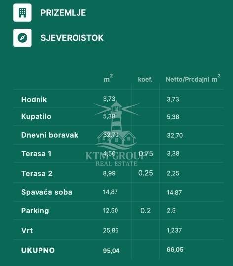 Sveukupno 95,04 m²,a ukupna netto korisna površina stana sa svim pripacima iznosi 66,05 m².