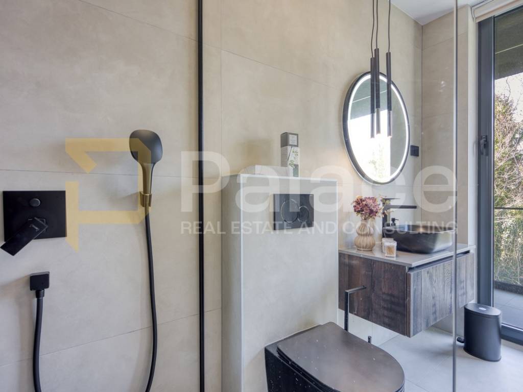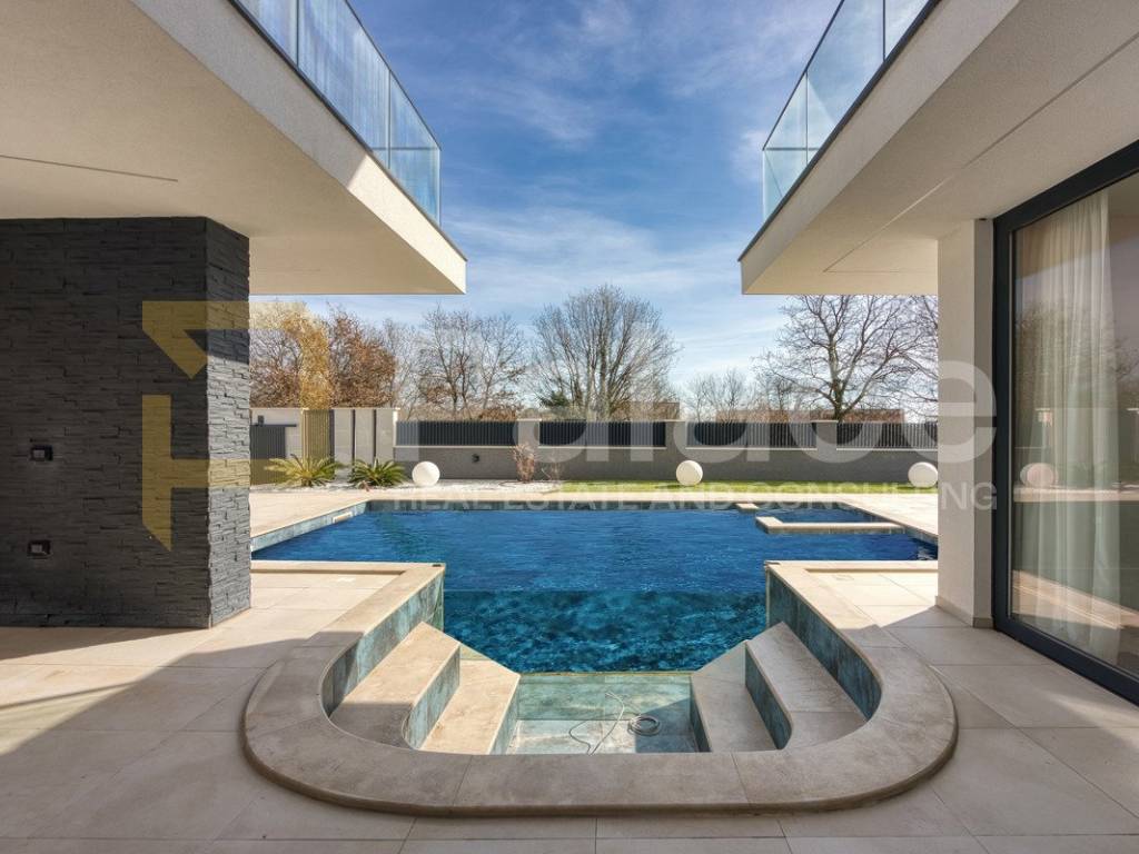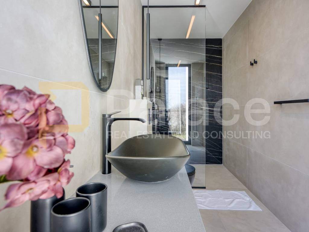 Posebnu arhitektonsku vrijednost daje ukopani separe s impresivnim staklenim pogledom u bazen, stvarajući jedinstven vizualni doživljaj i atmosferu privatnog resorta. Velika terasa, grijani bazen s hidromasažnim mlaznicama (jacuzzi efekt) te besprijekorno uređena okućnica zaokružuju vanjski prostor koji je osmišljen za hedonizam, opuštanje i druženje u potpunoj intimi.