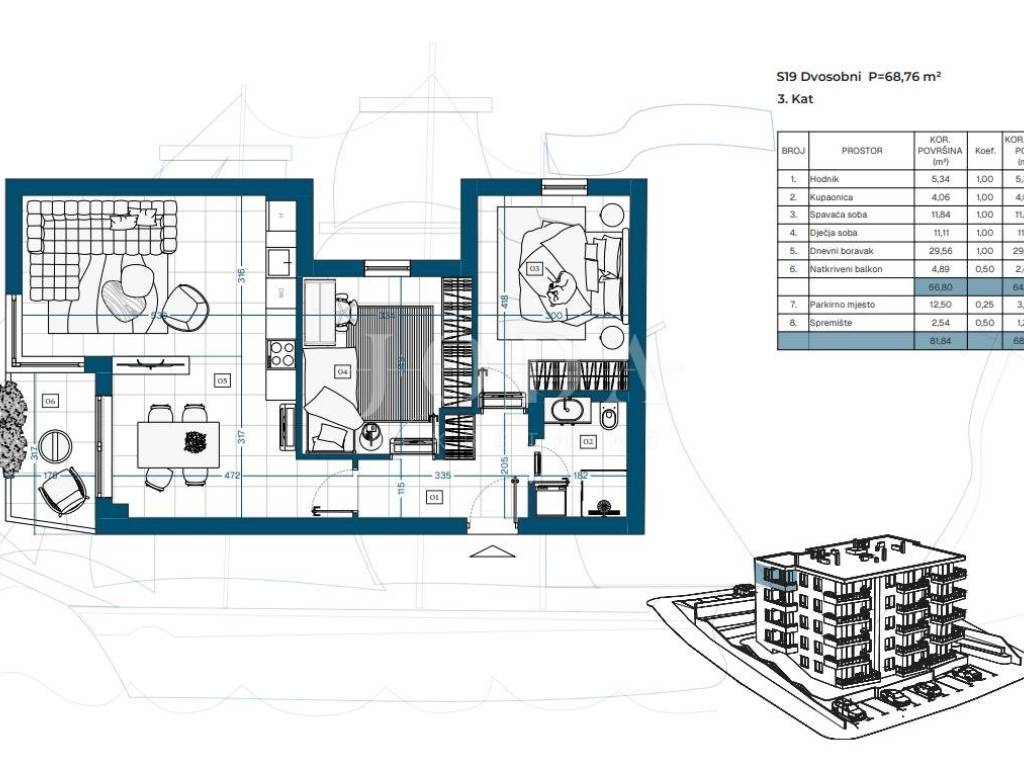 Stan S19 na trećem katu ima 68,13 m. Viša etaža osigurava više svjetlosti i privatnosti.