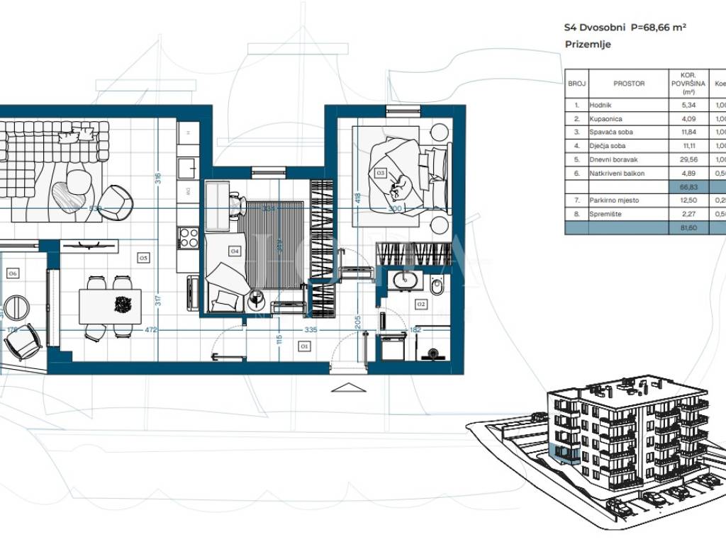 Stan S4 nalazi se u prizemlju i ima ukupnu obračunsku površinu 68,02 m. Prostran i funkcionalan, idealan je za obiteljski život. U cijenu su uključeni ostava i parkirno mjesto.