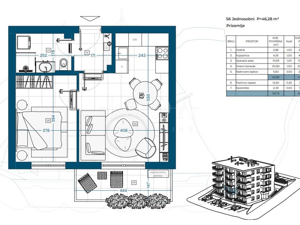 Stan S6 je jednosoban stan obračunske površine 45,64 m. Pametno organiziran prostor s balkonom pruža maksimalnu iskoristivost. U cijenu uključeni ostava i parkirno mjesto.