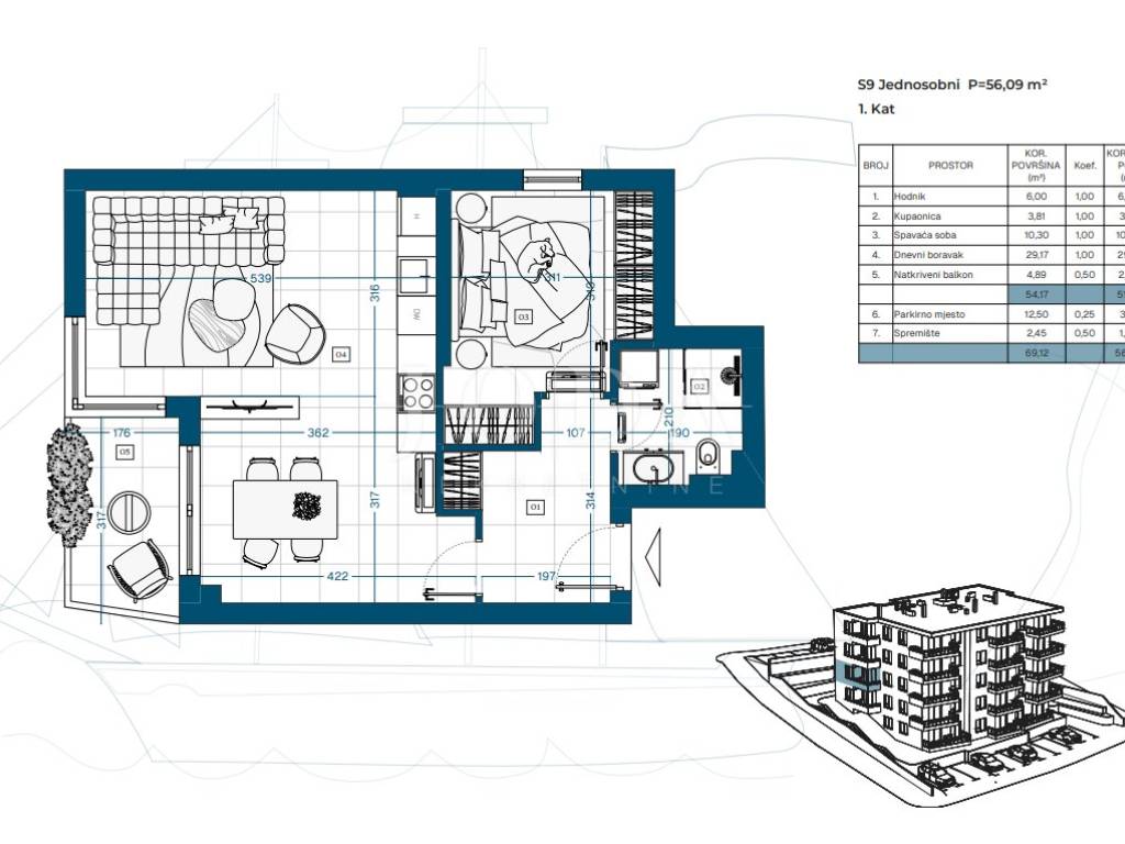 Stan S9 nalazi se na prvom katu i ima 55,45 m. Svijetao i funkcionalan, savršen za miran život ili investiciju.