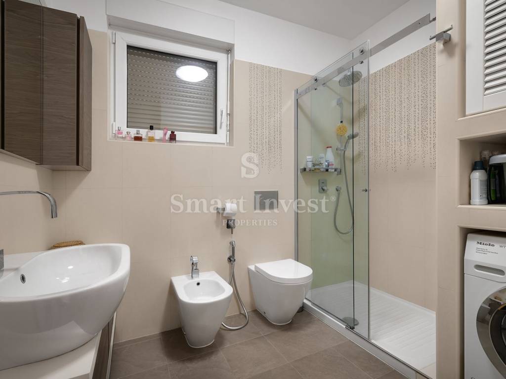 Ovaj prekrasan stan je dizajniran za maksimalnu udobnost. Na raspolaganju su vam prostrana stražnja terasa u hladu, hodnik, kupaonica, tri spavaće sobe, open space dnevni boravak s kuhinjom i blagovaonicom s izlazom na prostrani balkon - idealno mjesto za druženje s obitelji i prijateljima te uživanje u zaista spektakularnom pogledu na more.