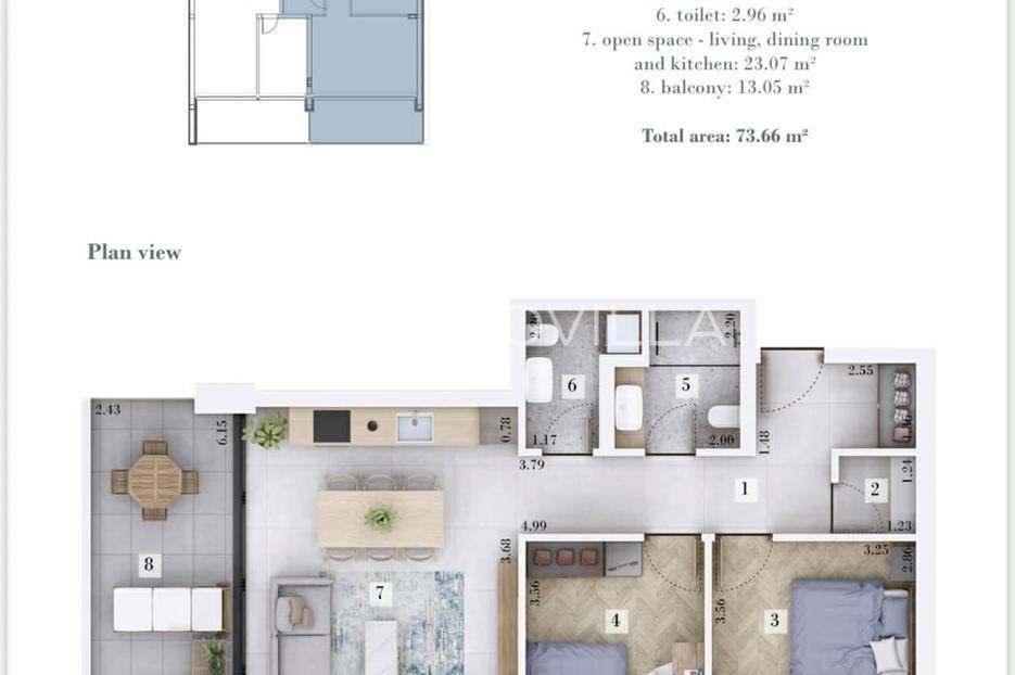 U mirnom mjestu Sošići, nedaleko od Rovinja - jedne od najpoželjnijih i najtraženijih destinacija u Istri - smjestio se ovaj moderan stan na prvom katu kvalitetne novogradnje čiji je završetak planiran u lipnju 2026. Smješten u oazi mira okruženoj prirodom, stan predstavlja idealnu priliku za ugodan obiteljski život ili sigurnu investiciju u jednog od najbrže rastućih krajeva regije.Stan se u 73,66 m2 rasporedio na ulazni hodnik, prostrani dnevni boravak s kuhinjom i blagovaonicom, dvije spavaće sobe, kupaonice, zasebnog gostinjskog WC-a i terase.Nekretnina odlikuje privlačan eksterijer s modernom fasadom obloženom dekorativnim kamenom, dok su veliki aluminijski portali u antracit boji s trostrukim staklom zaslužni za obilje prirodnog svjetla i elegantan izgled interijera. Podizno-klizna balkonska vrata stvaraju savršenu poveznicu između unutarnjeg prostora i vlastitog vrta koji ovaj stan čini posebno atraktivnim.Uz stan dolaze dva parkirna mjesta, a na parceli je predviđena mogućnost ugradnje električnog punjača za vozila.Unutrašnjost je pažljivo osmišljena kako bi pružila maksimalan komfor i estetiku. U cijelom stanu postavljene su visokokvalitetne talijanske pločice, dok je u spavaćoj sobi predviđena topla drvena podna obloga. Grijanje i hlađenje riješeno je putem MultiSplit sustava, uz dodatno podno grijanje u kuhinji i kupaonici za još veću udobnost. Detalji poput spuštenog dijela stropa koji diskretno skriva karnišu dodatno naglašavaju moderan i profinjen stil.Posebna pažnja posvećena je izboru opreme i materijala: inverterski bojler klase A osigurava energetsku učinkovitost, dok su slavine HansGrohe ili Grohe te sanitarije renomiranih marki Grohe ili Geberit jamstvo dugotrajne kvalitete. Zajednički prostori također odišu elegancijom, s granitnim kamenom u hodniku i kovanim ogradama s drvenim rukohvatom koji daju luksuzan završni dojam.Lokacija stana dodatno upotpunjuje njegovu vrijednost. U krugu od svega nekoliko minuta nalaze se škola, vrtić, supermarket, restoran i javni prijevoz, dok su Rovinj i autocesta udaljeni tek nekoliko kilometara, omogućujući izvrsnu prometnu povezanost i brz pristup svim sadržajima.Ovaj stan u Sošićima savršena je sinergija moderne arhitekture, kvalitetne gradnje, praktičnosti i mirnog okruženja - idealan dom za one koji žele živjeti u blizini Rovinja, a istovremeno uživati u prirodi i privatnosti.Za sve dodatne informacije i dogovor oko razgledavanja, stojimo Vam na raspolaganju.... Više na eurovilla.hr, ID: 861695