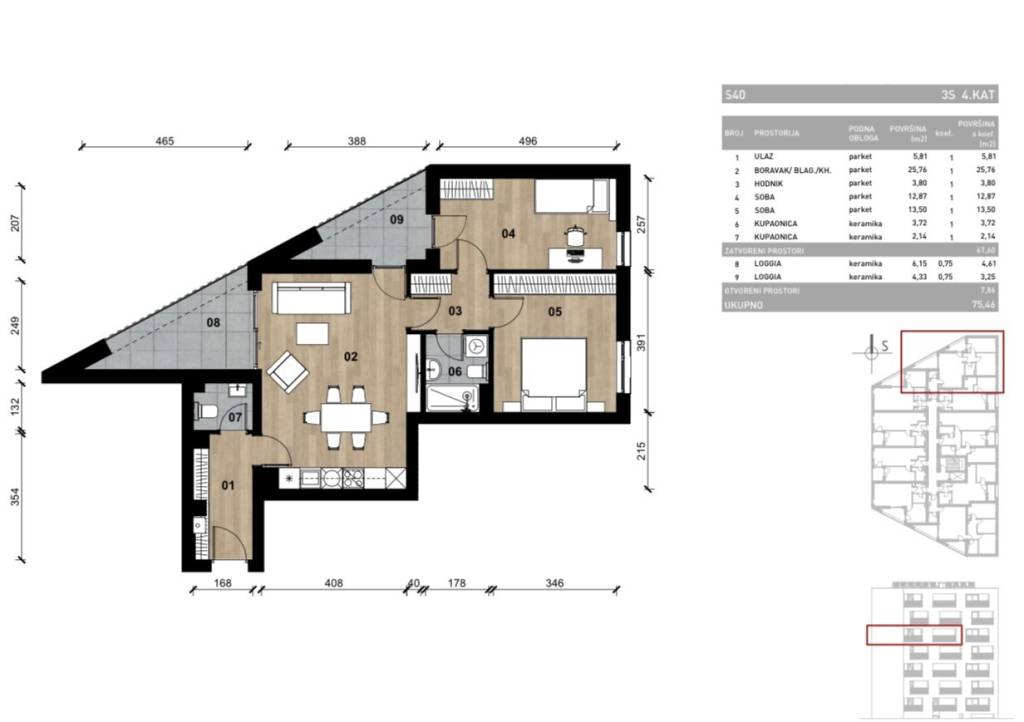 Zagreb, Vrapče, novogradnja na šest etaža s podzemnom garažom i vanjskim parkirnim mjestima.Stan S-40 trosoban stan na prvom katu, unutrašnje površine 67,40 m2.Sastoji se od: ulaza, open space dnevnog boravka s blagovaonicom i kuhinjom, hodnika, dvije spavaće sobe, dvije kupaonice i dvije loggie (površine 6,15 m2 i 4,33 m2), sveukupno 75,46 m2.Objekt je projektiran prema najsuvremenijim standardima gradnje; dok je čitava konstrukcija armirano - betonska. Ravni krov je neprohodni, izoliran hidroizolacijskim folijama nove generacije, te toplinskom izolacijom debljine 20 cm. Fasada je također izvedena u ETICS sustavu s toplinskom stiropor izolacijom debljine 15 cm, što u konačnici svrstava zgradu u A energetski razred.Pomno je biran svaki detalj, pa je tako vanjska stolarija u izvedbi aluminij - drvo s troslojnim staklom, sva rasvjeta u LED izvedbi, keramičke pločice su prve klase u sanitarnim čvorovima i terasama, a sva sanitarna oprema je visoke kvalitete poznatih svjetskih proizvođača.Dnevni boravci opremljeni su zidnim klima uređajima, dok je grijanje i topla voda preko kondenzacijskih bojlera.Zgrada je opremljena dizalom, zelene su površine hortikulturno uređene s odvojenim prostorom za smještaj kanti za otpad.Odlična lokacija, blizina javnog prijevoza, ljekarne, trgovina, restorana, veterinara, centra za ljepotu i ostalih sadržaja.Za sva dodatna pitanja stojimo na raspolaganju.... Više na eurovilla.hr, ID: 864723