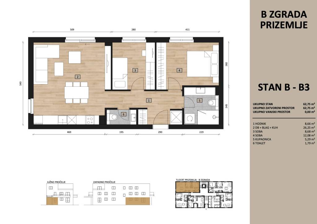 SVETA KLARA - LUKORANSKA ULICAModeran trosoban stan 65.88 m² u visokom prizemlju novogradnje - useljenje 12/2026.Na prodaju je stan oznake B3 koji se nalazi u prizemlju zgrade B (ukupno 14 stanova).Stan se sastoji od:ulaznog hodnika,otvorenog prostora koji objedinjuje kuhinju, blagovaonicu i dnevni boravak,dvije spavaće sobe,gostinjskog toaleta,kupaonica.Stanu pripada nenatkriveno parkirno mjesto, uz mogućnost kupnje spremišta.Zgrada je izgrađena prema najvišim standardima moderne gradnje:lift SchindlerDaikin dizalica topline za podno grijanje,hlađenje putem Daikin klima uređaja,PVC stolarija s trostrukim staklima i električnim roletama,fasadni sustav 12 cm,protuprovalna vrata,keramika prve klase,Galeković parketi,visina stropa 260 cm.Odlična mikrolokacija - u neposrednoj blizini nalaze se škola, vrtić, trgovine, autobusna linija, Savski most (tramvaj), Arena Centar, Avenue Mall i Bundek.Za dodatne informacije i razgled, stojimo vam na raspolaganju!... Više na eurovilla.hr, ID: 896159