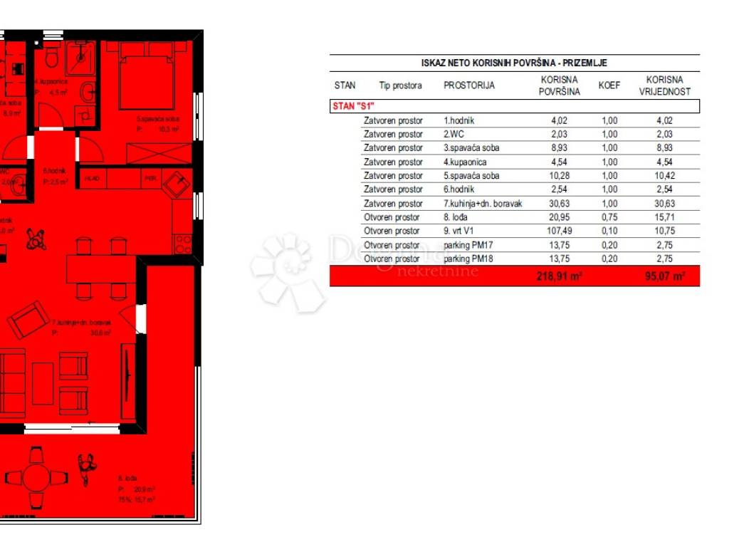 Površina stana je 95,07m2 korisne vrijednosti.