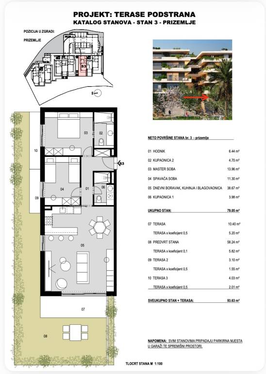 TERASE PODSTRANA | Ekskluzivan projekt novogradnje uz moreSplit - Podstrana | Luksuzna stambeno-poslovna zgrada suvremenog dizajnaProjekt TERASE u Podstrani predstavlja ekskluzivnu novogradnju smještenu na jednoj od najatraktivnijih mikrolokacija . Riječ je o luksuznoj stambeno-poslovnoj zgradi s ukupno 57 stambenih jedinica, projektiranoj i građenoj prema najvišim standardima kvalitete, s posebnim naglaskom na moderan, funkcionalan i suvremen način života. Planirano useljenje predviđeno je u drugoj polovici 2028. godine.STAN S3 - dvosoban stan smješten na etaži visokog prizemlja zgrade, zatvorene površine 79, 05 m², kojem dodatnu vrijednost daju natkrivena terase površine 17, 53 m² te prostrani privatni vrt površine 58, 24 m². Funkcionalan raspored prostora obuhvaća ulazni hodnik, dvije spavaće sobe od kojih jedna s pripadajućom kupaonicom, kupaonicu te dnevni boravak s blagovaonicom i kuhinjom otvorenog tlocrta s izlazom na terasu i vrt koji okružuje stan.U cijenu stana uključena su dva garažna parkirna mjesta ukupne površine 30 m² te spremište površine 4 m², dok ukupna obračunska površina stana iznosi 110, 63 m². Stan će biti opremljen vrhunskom opremom koja uključuje dizalicu topline, podno grijanje cijelog stana, klimatizaciju u svim prostorijama, ALU stolariju, protuprovalna ulazna vrata, parket prve klase te visokokvalitetnu keramiku i sanitarnu opremu.Nekretnina se nalazi svega 200 metara od mora, neposredno iznad hotela Le Méridien Lav, u blizini svih potrebnih sadržaja, što ovu lokaciju čini idealnim izborom za ugodan i kvalitetan život ili investiciju.Za sve dodatne informacije stojimo na raspolaganju.... Više na eurovilla.hr, ID: 945661