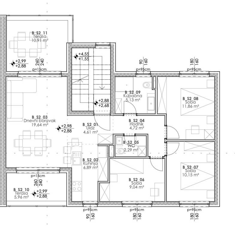 Solin, Mravince, na mirnoj lokaciji idealnoj za obiteljski život , predviđena je izgradnja manjeg stambenog objekta moderne vizure, s funkcionalnim rasporedom stambenih jedinica.Stan S4 - smješten je na prvoj etaži, a u naravni je trosoban stan. Sastoji se od ulaznog hodnika, kupaonice, WC-a, tri spavaće sobe i dnevnog prostora ( kuhinja s blagovaonicom i dnevni boravak ). Pripadaju mu dvije terase površine 5, 96 m2 i 10, 92 m2. Površina zatvorenog stambenog dijela iznosi 74, 33 m2, dok je ukupna 84, 25 m2.Obavezna je kupnja garažnog ili vanjskog parkirnog mjesta.Početak gradnje je predviđen u prvoj polovici 2026. godine.Za sva dodatna pitanja, stojimo vam na raspolaganju.... Više na eurovilla.hr, ID: 997192