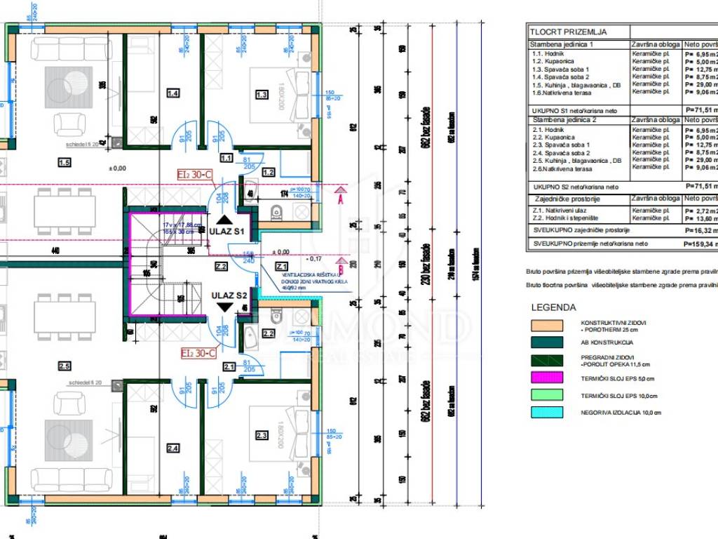 Prizemlje se sastoji od 2 stana, svaki neto površine 66,98 m². Svakom stanu pripadaju: 2 terase, vlastiti vrt (74 m² i 90 m²), 1 parkirno mjesto (pripadci nisu uključeni u navedenu neto kvadraturu)