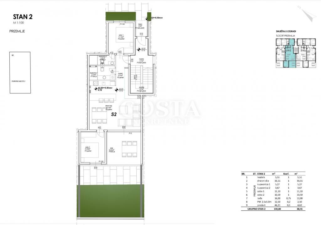 Prodaje se stan u izgradnji u mjestu Privlaka u blizini Zadra. Stan površine 69,29 m2 nalazi se u prizemlju stambene zgrade s 10 jedinica. Sastoji se od dnevnog boravka, kuhinje i blagovaone, dvije spavaće sobe, dvije kupaonice, garderobe, hodnika i lođe od dodatnih 16 m2. Stanu pripada i vrt od 46,21 m2 i privatno parkirno mjesto u dvorištu zgrade. Sveukupna korisna površina stana zajedno s pripacima iznosi 144 m2 (K.V. 88,41 m2).