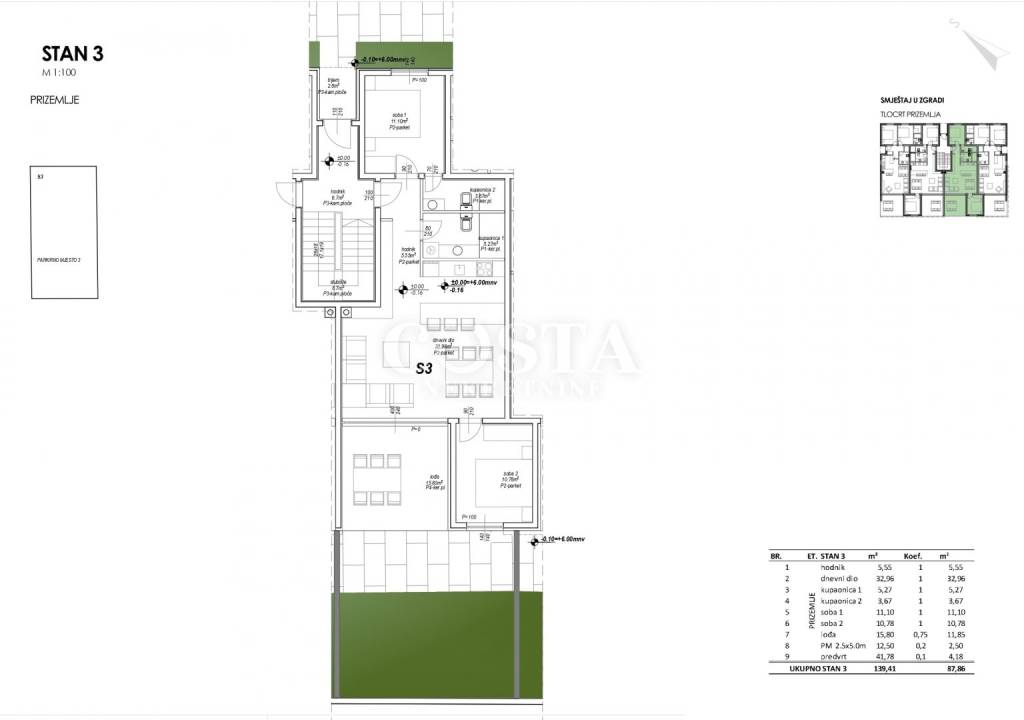 Prodaje se stan u izgradnji u mjestu Privlaka u blizini Zadra. Stan površine 69,33 m2 nalazi se u prizemlju stambene zgrade s 10 jedinica. Sastoji se od dnevnog boravka, kuhinje i blagovaone, dvije spavaće sobe, dvije kupaonice, garderobe, hodnika i lođe od dodatnih 15,80 m2. Stanu pripada i vrt od 41,78 m2 i privatno parkirno mjesto u dvorištu zgrade. Sveukupna korisna površina stana zajedno s pripacima iznosi 139,41 m2 (K.V. 87,86 m2).