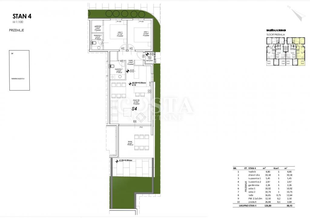 Prodaje se stan u izgradnji u mjestu Privlaka u blizini Zadra. Stan površine 70,61 m2 nalazi se u prizemlju stambene zgrade s 10 jedinica. Sastoji se od dnevnog boravka, kuhinje i blagovaone, dvije spavaće sobe, dvije kupaonice, garderobe, hodnika i lođe od dodatnih 16,85 m2. Stanu pripada i vrt od 26,84 m2 i privatno parkirno mjesto u dvorištu zgrade. Sveukupna korisna površina stana zajedno s pripacima iznosi 126,80 m2 (K.V. 88,43 m2).