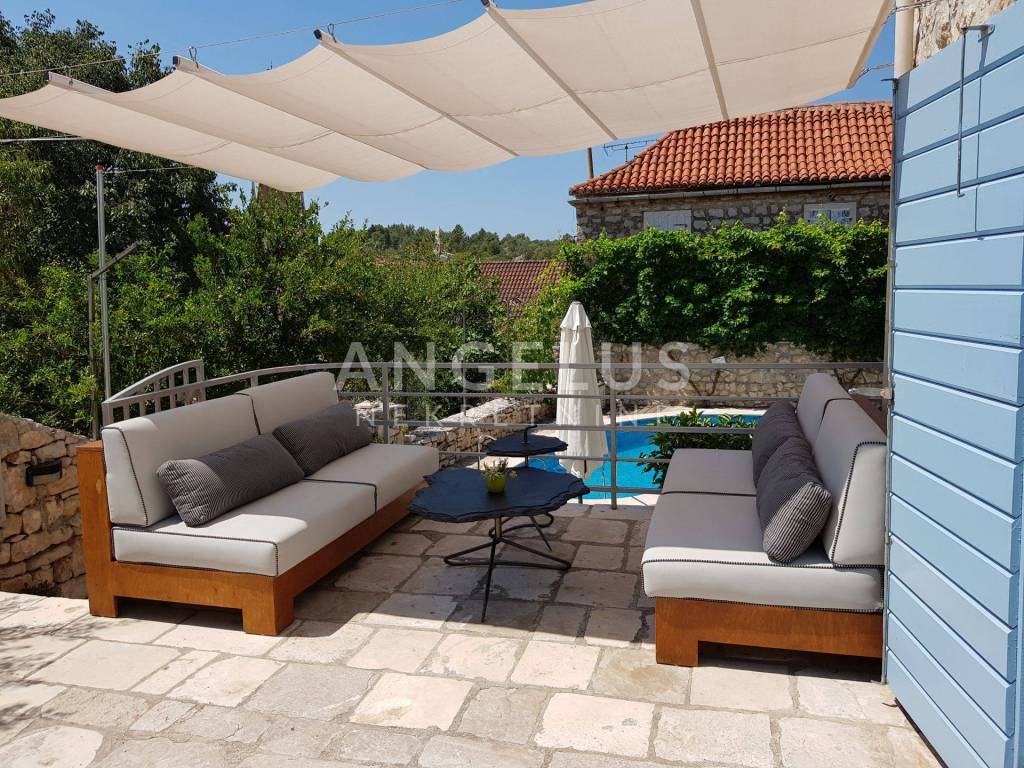 Agencija za nekretnine Angelus nekretnine Vam nude na prodaju renoviranu kamenu kuću u centru mjesta Milne na otoku Braču, sa dvorom i bazenom