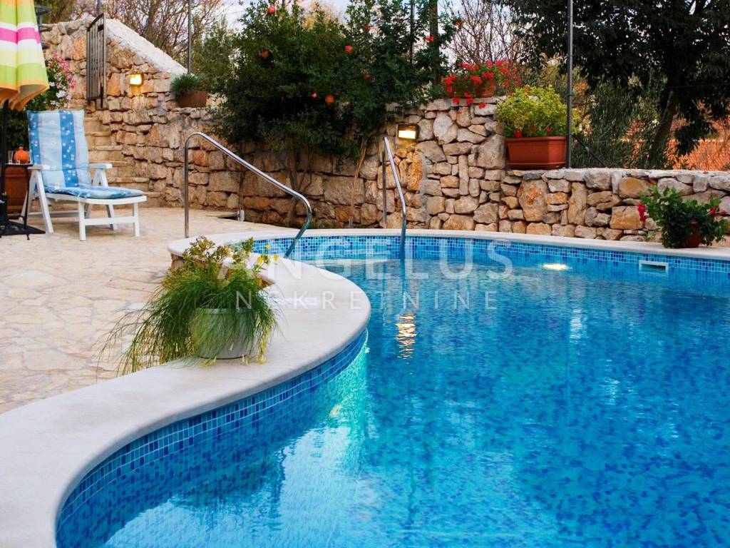 Posebnu vrijednost ovoj nekretnini daje njezin vanjski prostor rijetkost u starim dalmatinskim jezgrama. Ispred kuće smješten je bazen sa sunčalištem, diskretno uklopljen u kameni ambijent i okružen mediteranskim biljem koje pruža intimu i prirodnu hladovinu. Uz bazen se nalazi natkrivena ljetna kuhinja s kaminom i velikim stolom, savršena za duga ljetna druženja i autentično iskustvo života na otvorenom.