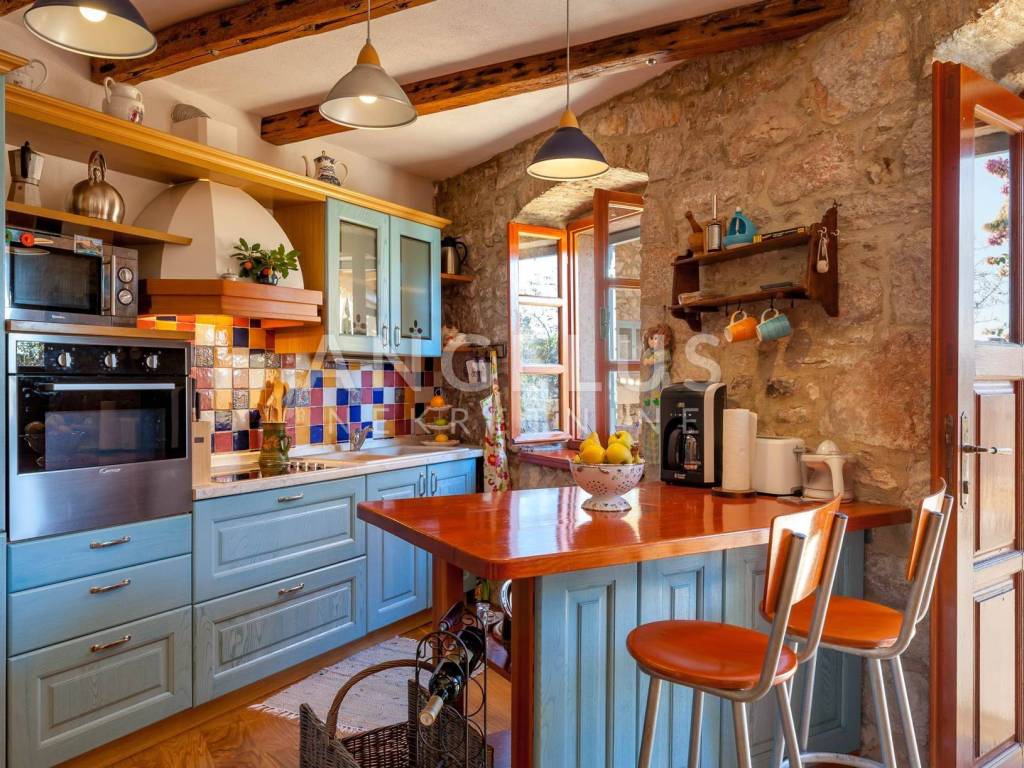 Kuća je raspoređena na tri etaže i osmišljena kao skladna cjelina u kojoj se tradicionalna arhitektura susreće sa suvremenom udobnošću. Prizemlje čini otvoreni životni prostor u kojem se kuhinja, blagovaonica i dnevni boravak prirodno nadovezuju jedan na drugi. Središnje mjesto zauzima kamin koji prostoru daje toplinu i intimnu atmosferu, čineći boravak ugodnim tijekom cijele godine. Iz dnevnog dijela izlazi se na kamenu terasu koja postaje produžetak interijera mjesto gdje se jutra započinju uz kavu, a večeri završavaju uz čašu vina pod otvorenim nebom.