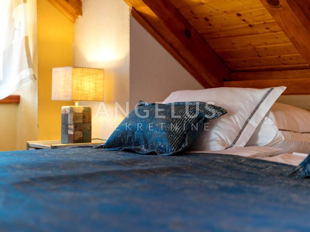 Na prvom katu smještene su dvije spavaće sobe i kupaonica. Potkrovlje skriva treću spavaću sobu, kupaonicu i izlaz na prostranu terasu, s koje se pruža pogled na slikovitu jezgru mjesta i okolne krovove. To je prostor stvoren za mir, tišinu i osjećaj izdvojenosti, iako se nalazite u samom centru.