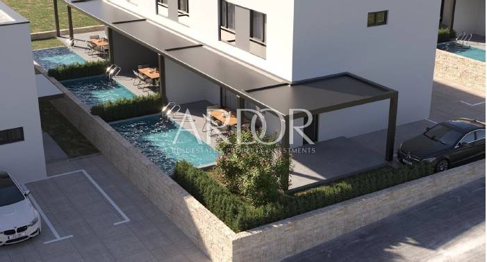 Nekretnina uključuje dva vanjska nenatkrivena parkirna mjesta ukupne površine 25 m². Ulazna vrata su visokokvalitetna, izrađena od višekomornih profila, dok je unutarnja stolarija modernog dizajna i vrhunske izrade. Podne obloge čine keramičke pločice A klase velikog formata, koje dodatno naglašavaju suvremeni karakter prostora.