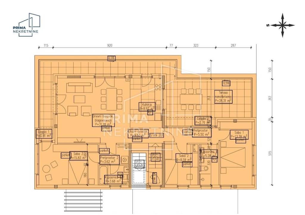 Ističe se velikom nenatkrivenom terasom površine 39 m2 koja pruža dodatni prostor za boravak na otvorenom i uživanje u privatnosti. Uz terasu, stanu pripadaju i dvije loggie (0,93 m2 i 2,81 m2), spremište površine 1,82 m2, garažno parkirno mjesto površine 17,10 m2 te jedno nenatkriveno parkirno mjesto površine 14,25 m2.