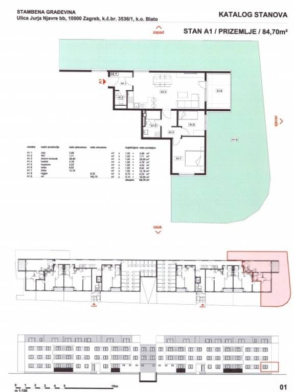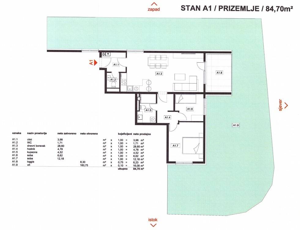 Stan A1: 3-sobni, prizemlje, neto korisne površine 84,70 m2, sastoji se od ulaznog prostora, dnevnog boravka s kuhinjom i blagovaonicom, dvije spavaće sobe, kupaonice, WC-a, loggie i vrta.