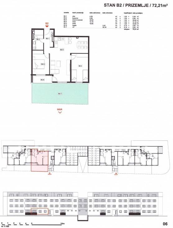Stan B2: 3-sobni, prizemlje, neto korisne površine 72,21 m2, sastoji se od ulaznog prostora, dnevnog boravka, kuhinje i blagovaonice, dvije spavaće sobe, kupaonice, loggie i vrta.