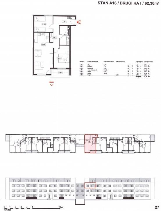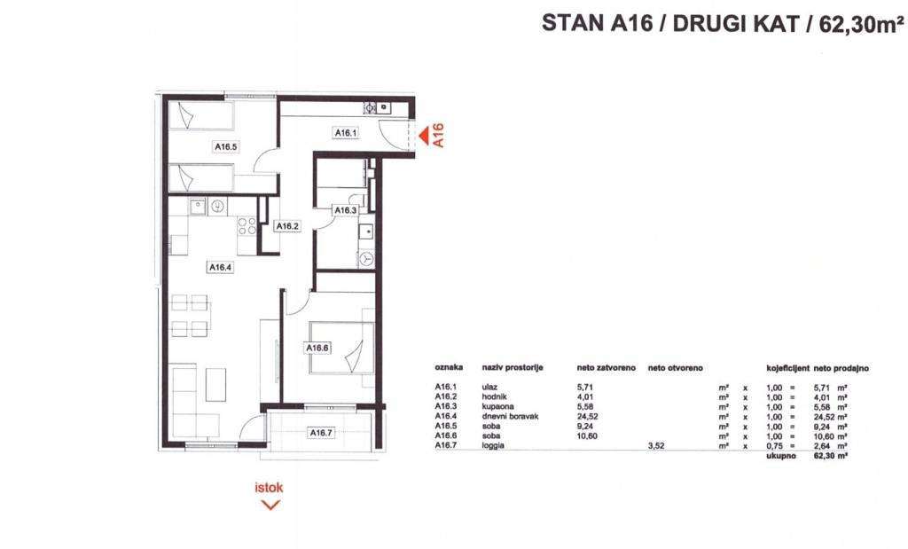 Stan A16: 3-sobni, 2. kat, neto korisne površine 62,30 m2, sastoji se od ulaznog prostora, dnevnog boravka s kuhinjom i blagovaonicom, dvije spavaće sobe, kupaonice i loggie.