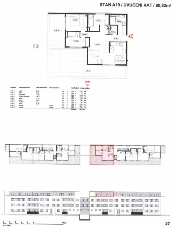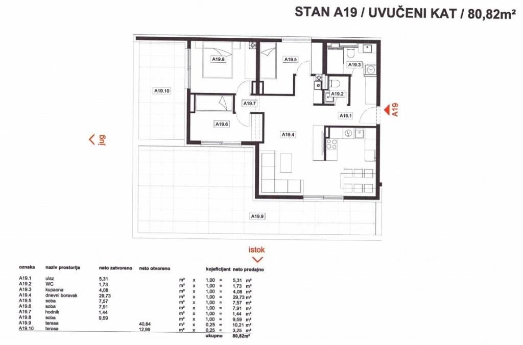 Stan A19: 4-sobni, 3. kat (penthouse), neto korisne površine 80,82 m2, sastoji se od ulaznog prostora, dnevnog boravka s kuhinjom i blagovaonicom, tri spavaće sobe, kupaonice, WC-a i dvije nenatkrivene terase.