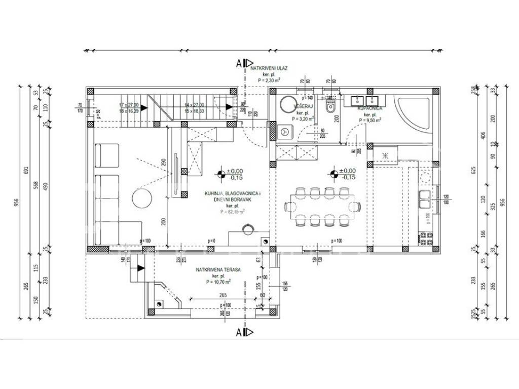 Prizemlje čini dnevni boravak, blagovaonica, kuhinja i hodnik ukupne površine 62 m2, kupaonica sa jacuzzi kadom površine 9 m2, te praonica/spremište površine 3 m2. Iz blagovaonice i dnevnog boravka izlazi se na natkrivenu terasu površine 11 m2 koja je okružena vrtom.