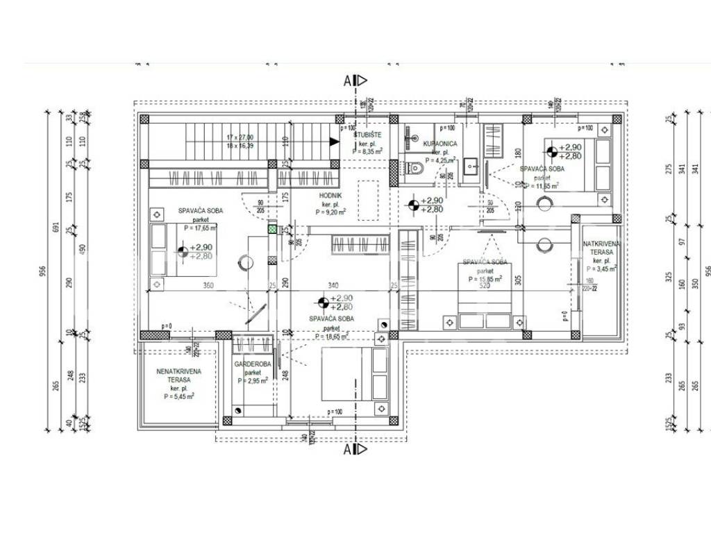 Na katu su smještene ukupno četiri spavaće sobe površina 12 m2, 18 m2, master soba s garderobom ukupne površine 21 m2 koja izlazi na natkrivenu terasu površine 5 m2, te spavaća soba površine 16 m2 koja također izlazi na terasu površine 3 m2. Na katu je dodatna kupaonica površine 4 m2, te hodnik površine 9 m2.