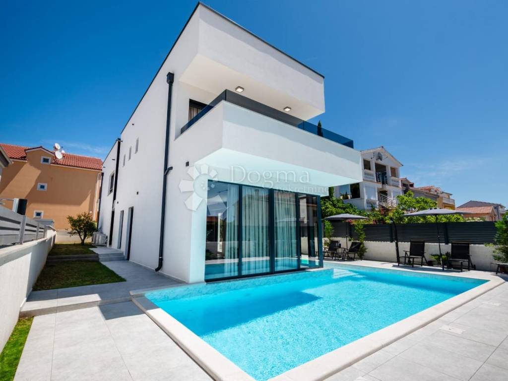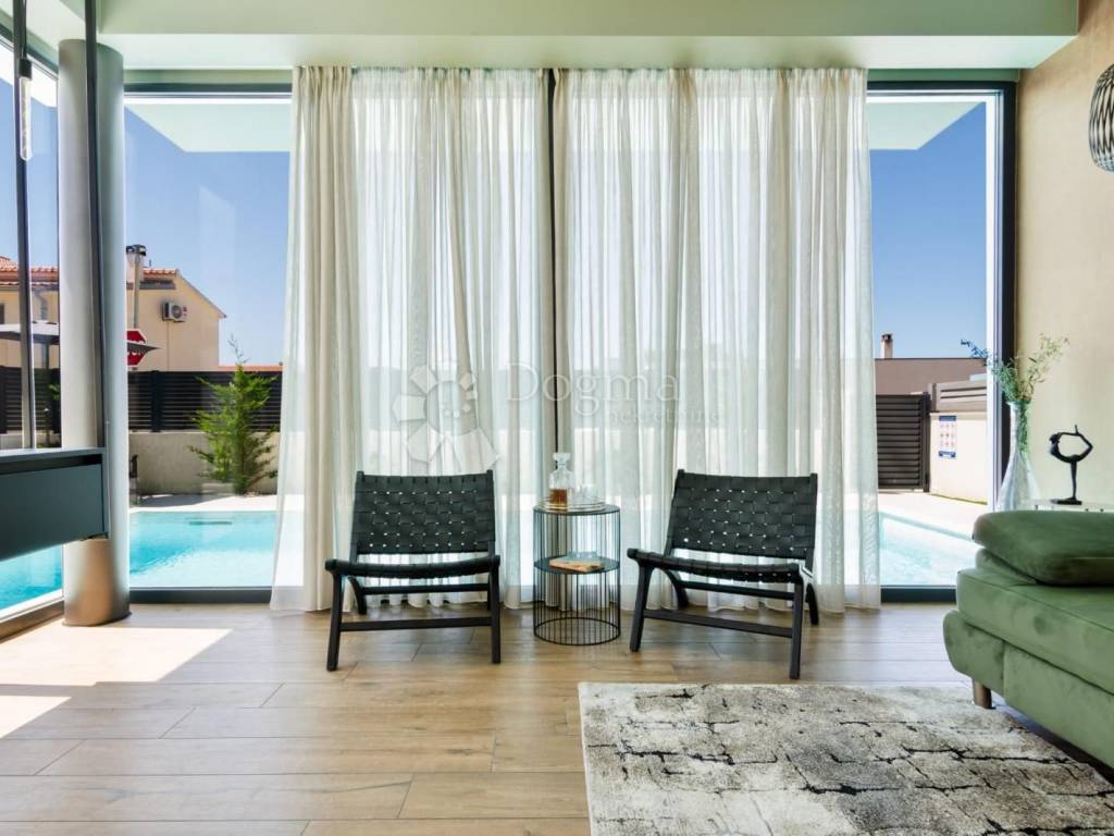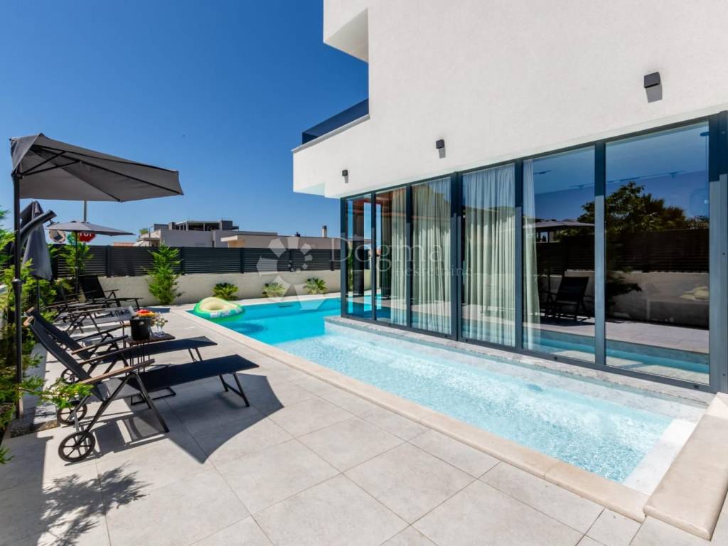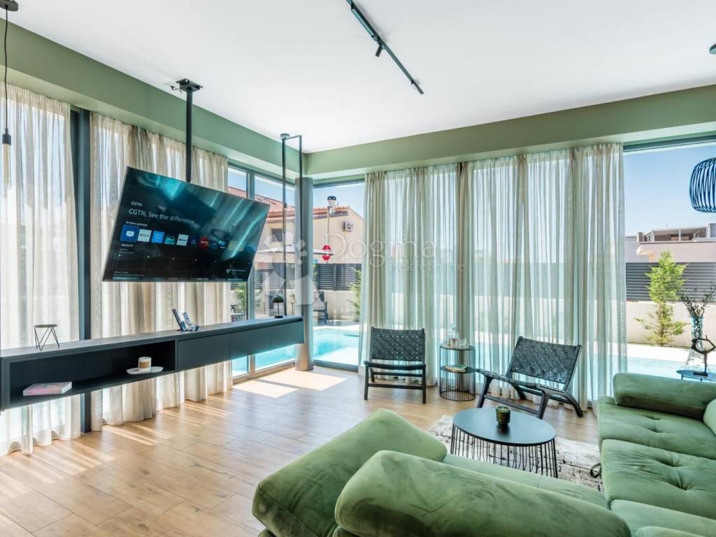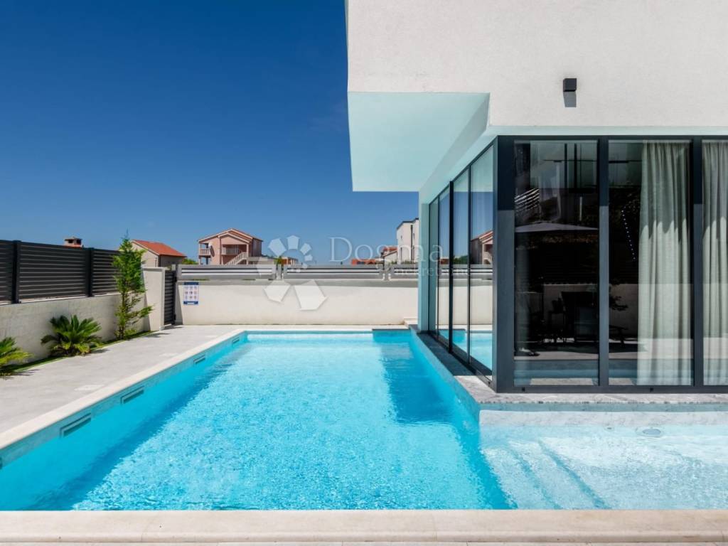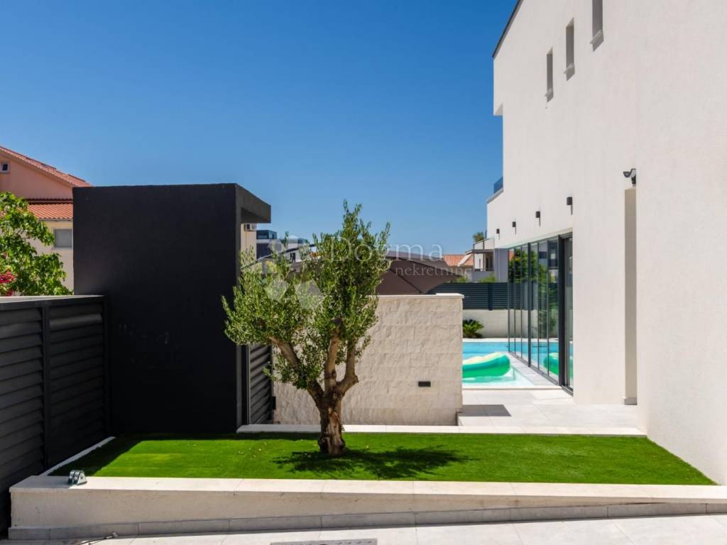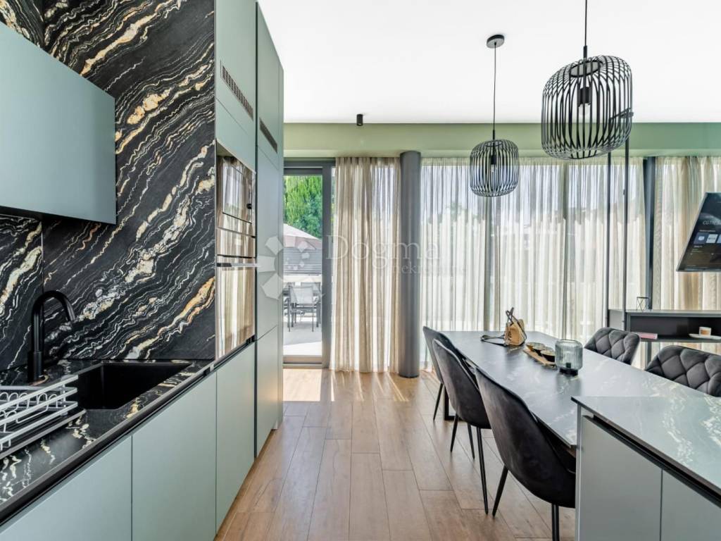 U prizemlju - predsoblje, kuhinja sa blagovaonicom, toalet, dnevni boravak, otvorena terasa, bazen 48 m2 - grijan na elektrolizu, - duboki i plitki dio, velika garaža za 2 automobila, te dva parkirna mijesta- ukupno dakle 4. U pripremi je i vanjska kuhinja s prostorom za objed ili boravak.