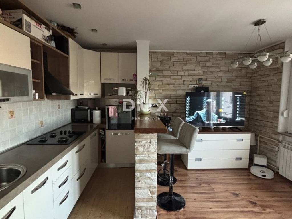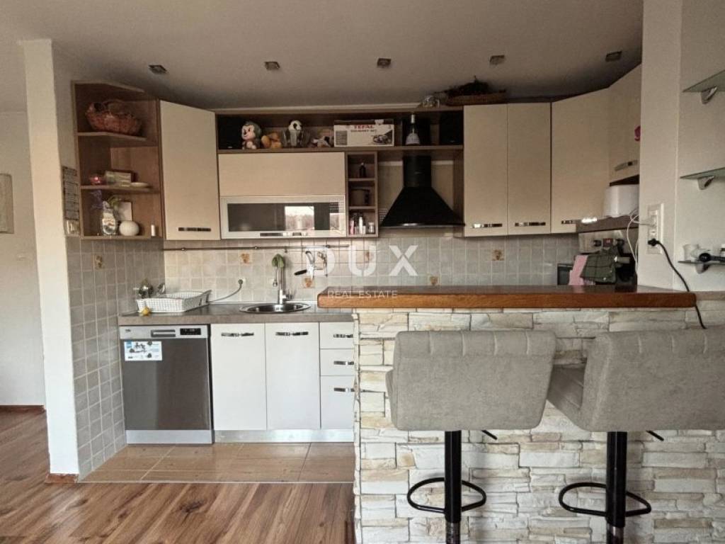 Dnevni boravak je svijetao i ugodan, opremljen TV-om te omogućuje smještaj većeg blagovaonskog stola. Kuhinja je u potpunosti opremljena pećnicom, mikrovalnom pećnicom, perilicom posuđa, pločom za kuhanje, napom, sudoperom te kuhinjskim ormarićima s dovoljno prostora za pohranu.