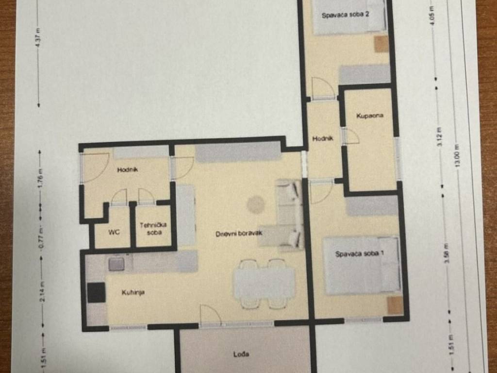 Stan se sastoji od dvije spavaće sobe, kupaonice s WC-om, zasebnog gostinjskog WC-a, prostranog dnevnog boravka povezanog s kuhinjom, tehničke sobe, balkona te ostave u podrumu. Raspored je funkcionalan i prilagođen modernom načinu života.