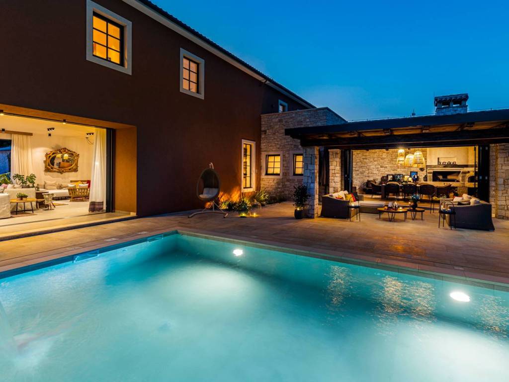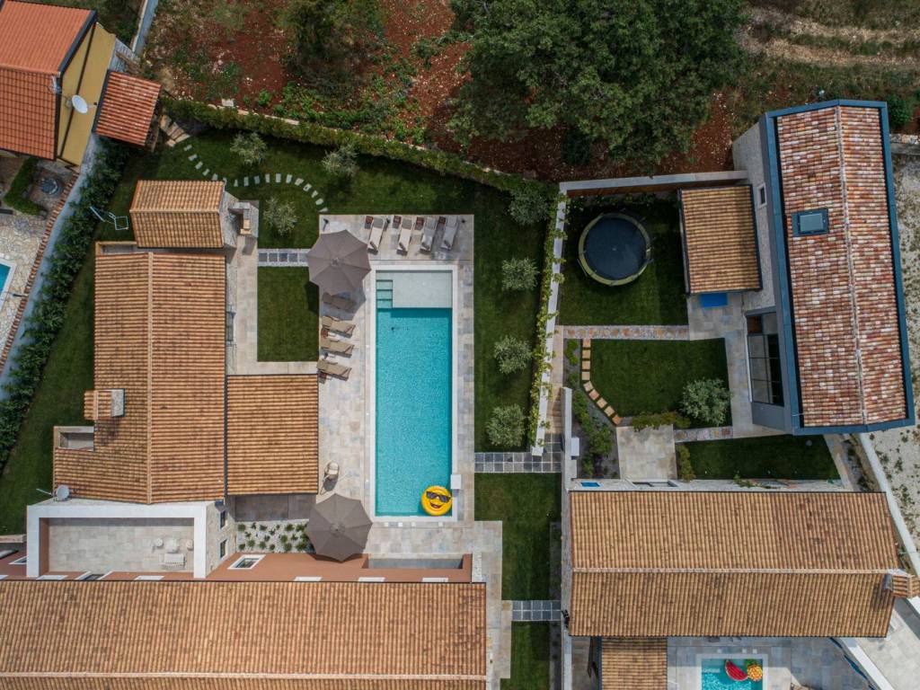 Kompleks novoizgrađenih luksuznih vila s velikim dvorištem , dva bazena i otvorenim pogledom na more .