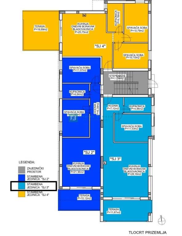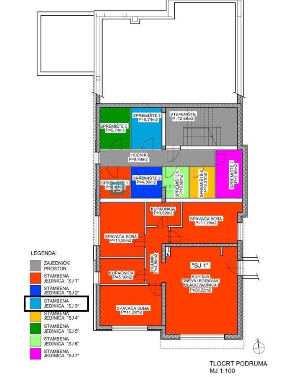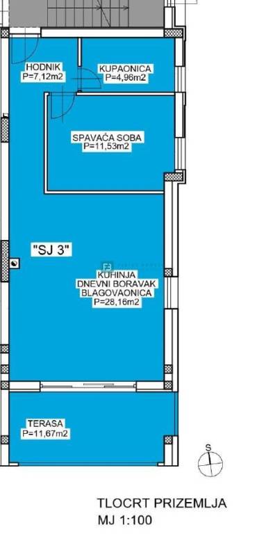 Stan SJ3 neto korisne površine 66,90 m2 (stambena površina 51,77 m2 + terasa 11,10 m2 + spremište 5,74 m2 m2 + parking 12,50 m2) nalazi se u visokom prizemlju. Odlične orijentacije jug-jugoistok sastoji se od ulaza/hodnika, kuhinje s blagovaonicom, dnevnog boravka s izlazom na lijepu natkrivenu terasu površine 11,10 m2, spavaće sobe i kupaonice. Stanu pripada spremište površine 5,74 m2 u podrumu zgrade te jedno vanjsko parkirno mjesto površine 12,50 m2 u velikom dvorištu zgrade.