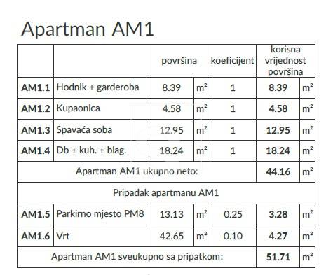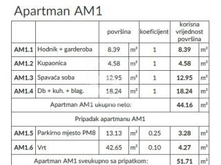 Upravo u ovom ekskluzivnom naselju, na manje od 200m od mora i plaža smjestila se ova moderna i luksuzna novogradnja. Zgrada se sastoji od 8 stambenih jedinica od kojih su 4 u prizemlju te 4 na 1. katu. Ista je projektirana od strane poznatih arhitekata što se vidi po samim vizualizacijama iste. Stanovi su različitih površina i kvadratura te tako imamo nekoliko stanova s jednom spavaćom sobom (1S+DB) te nekoliko stanova s dvije spavaće sobe (2S+DB). Svakom stanu pripada po jedno parkirno mjesto smješteno ispred same zgrade.