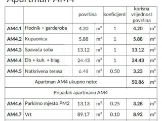 Stanovi su različitih površina i kvadratura te tako imamo nekoliko stanova s jednom spavaćom sobom (1S+DB) te nekoliko stanova s dvije spavaće sobe (2S+DB). Svakom stanu pripada po jedno parkirno mjesto smješteno ispred same zgrade.