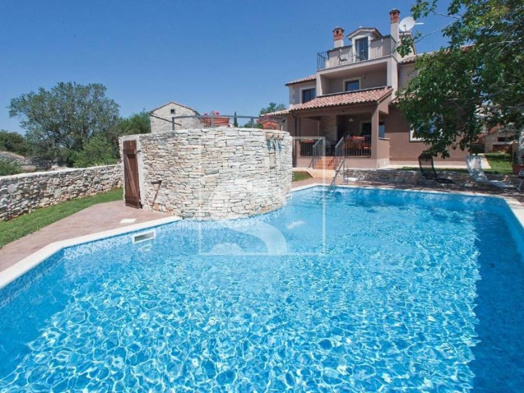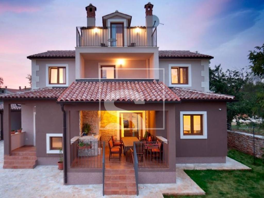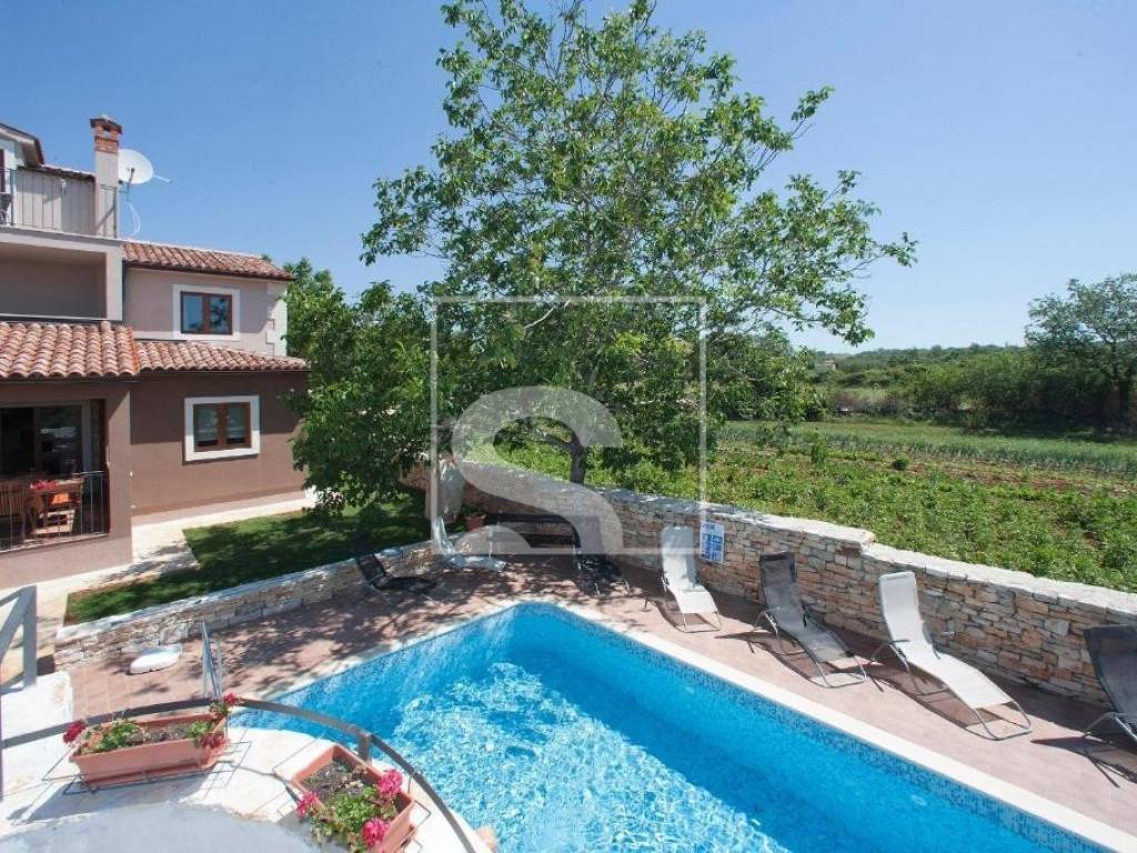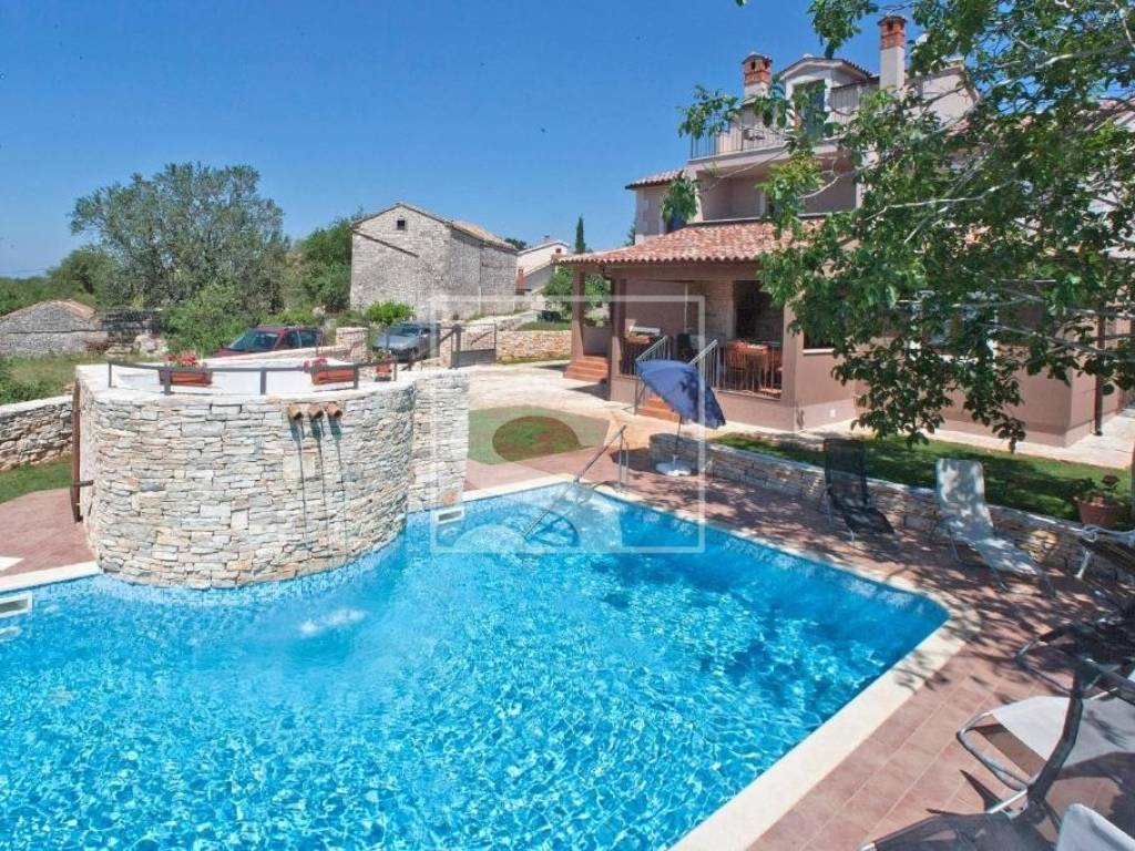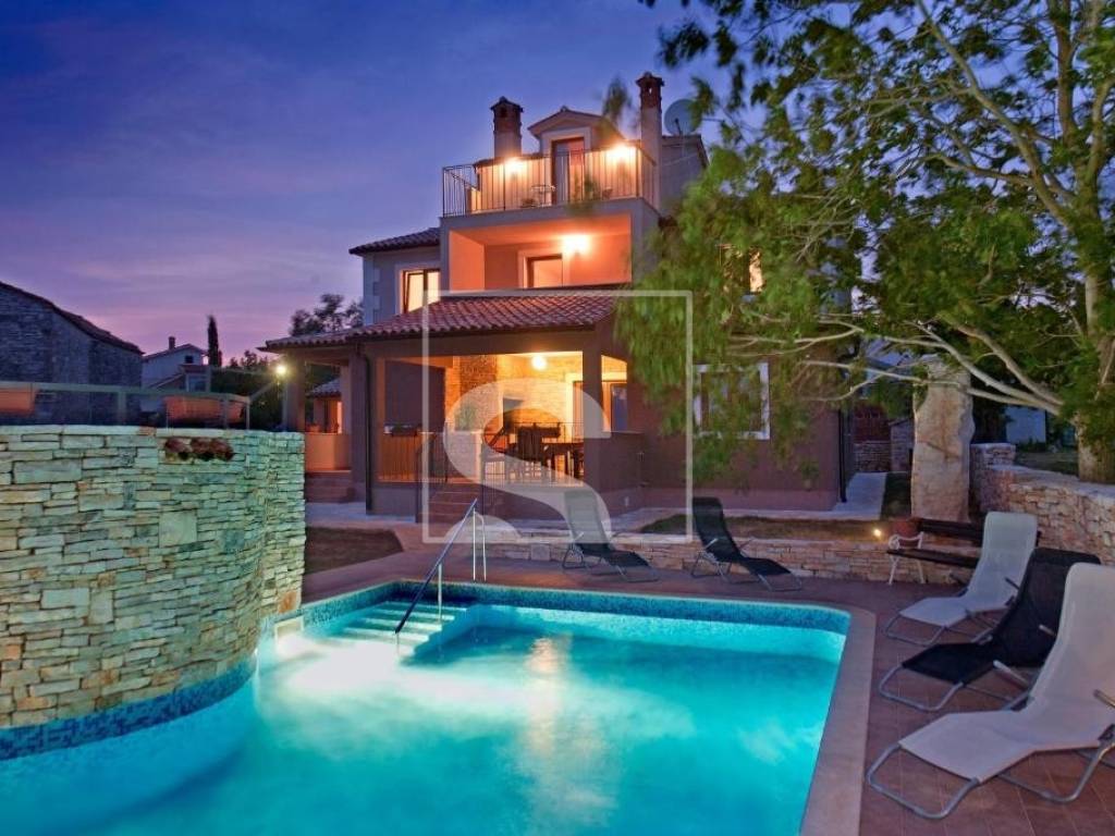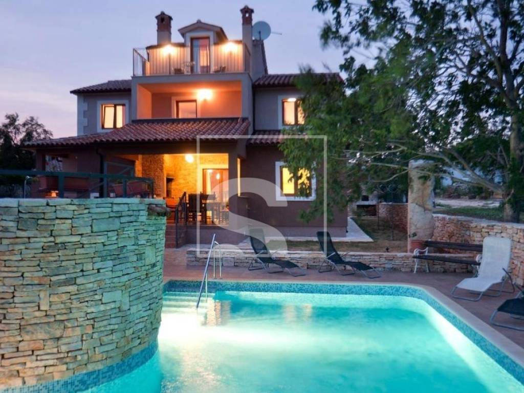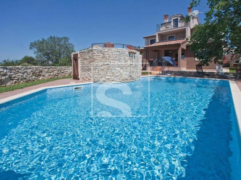 Svega par kilometra udaljeno od centra smjestila se ova moderna kuća s bazenom. Kuća je smještena na mirnoj lokaciji okružena kućama za odmor i obiteljskim kućama. Proteže se kroz četiri etaže, podrum, prizemlje, prvog kata i mansarde. U prizemlju se nalazi kuhinja s blagovaonicom, prostrani dnevni boravak, kupaona, spremište te natkrivena terasa s kaminom. Na katu su 5 spavaćih soba sa svojim kupaonicama te terasa s koje se pruža pogled na bazen, more i zelenilo prepuno livadama i šumama. Iz dnevnog boravka je izlaz na natkrivenu terasu i vrt gdje se nalazi bazen od 53 m². U sklopu bazena je predivan istarski kažun.