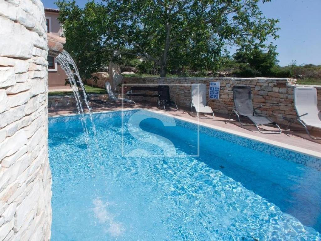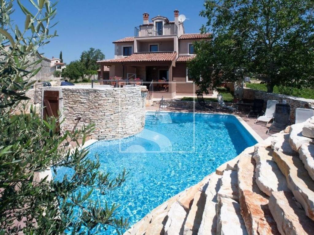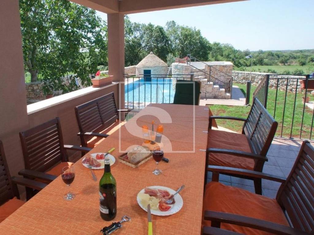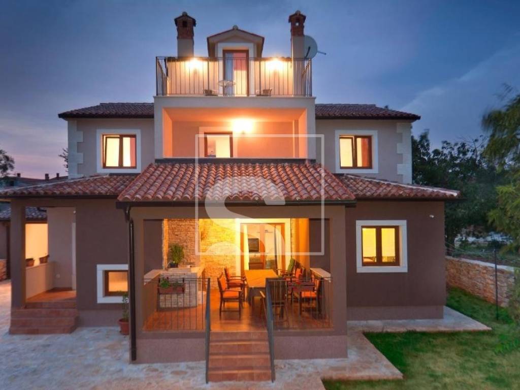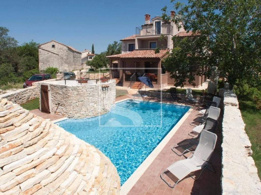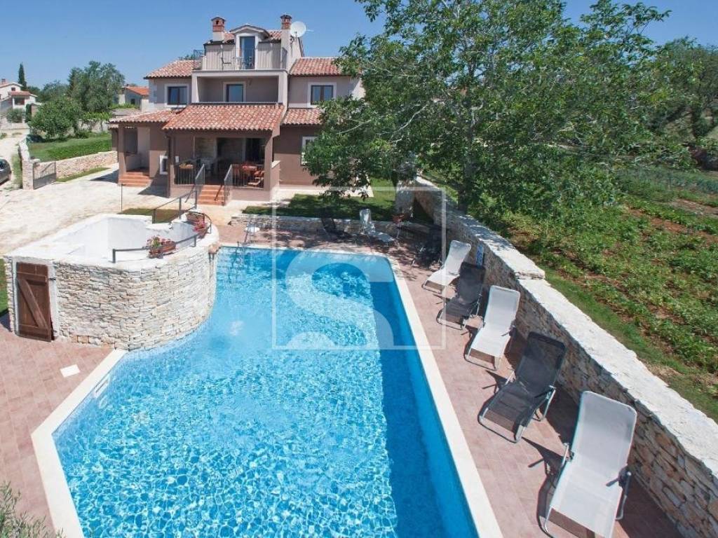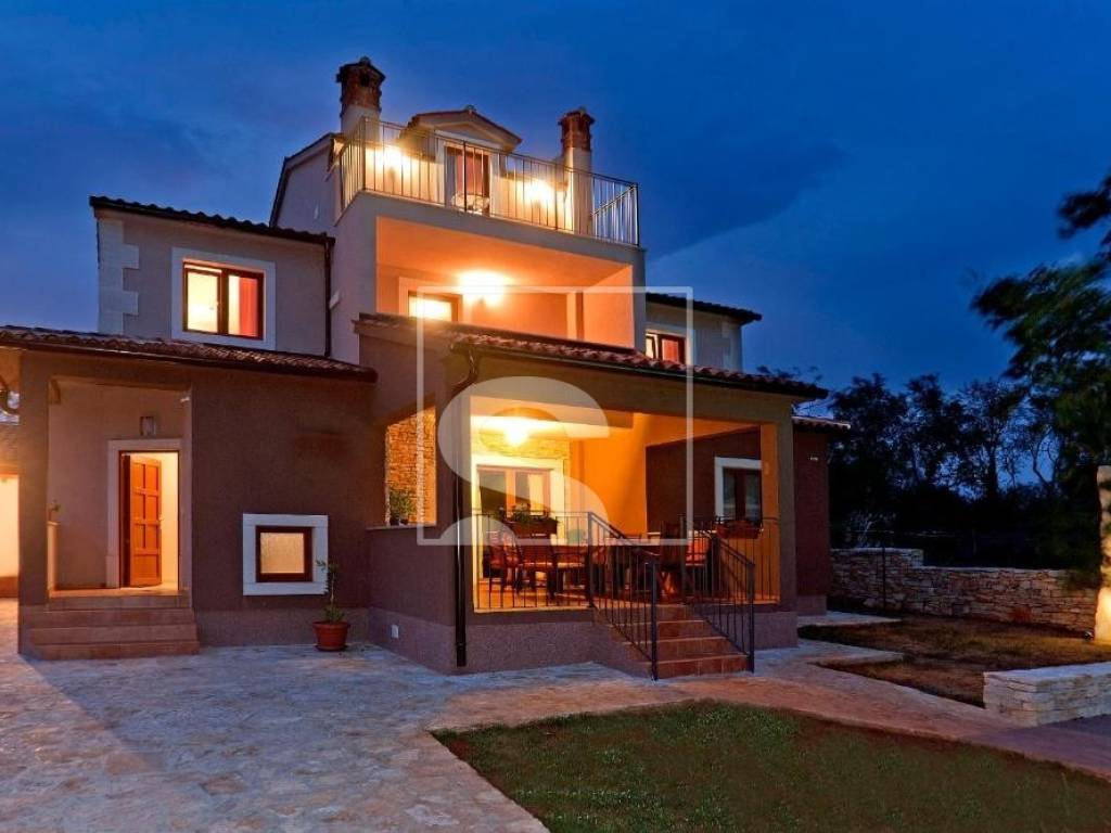 Svega par kilometra udaljeno od centra smjestila se ova moderna kuća s bazenom. Kuća je smještena na mirnoj lokaciji okružena kućama za odmor i obiteljskim kućama. Proteže se kroz četiri etaže, podrum, prizemlje, prvog kata i mansarde. U prizemlju se nalazi kuhinja s blagovaonicom, prostrani dnevni boravak, kupaona, spremište te natkrivena terasa s kaminom. Na katu su 5 spavaćih soba sa svojim kupaonicama te terasa s koje se pruža pogled na bazen, more i zelenilo prepuno livadama i šumama. Iz dnevnog boravka je izlaz na natkrivenu terasu i vrt gdje se nalazi bazen od 53 m². U sklopu bazena je predivan istarski kažun.