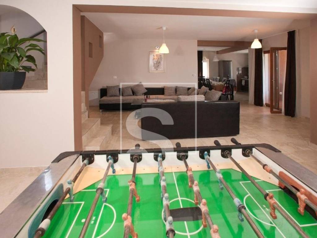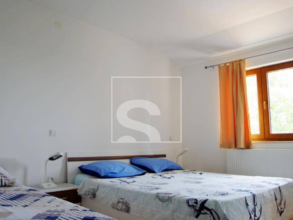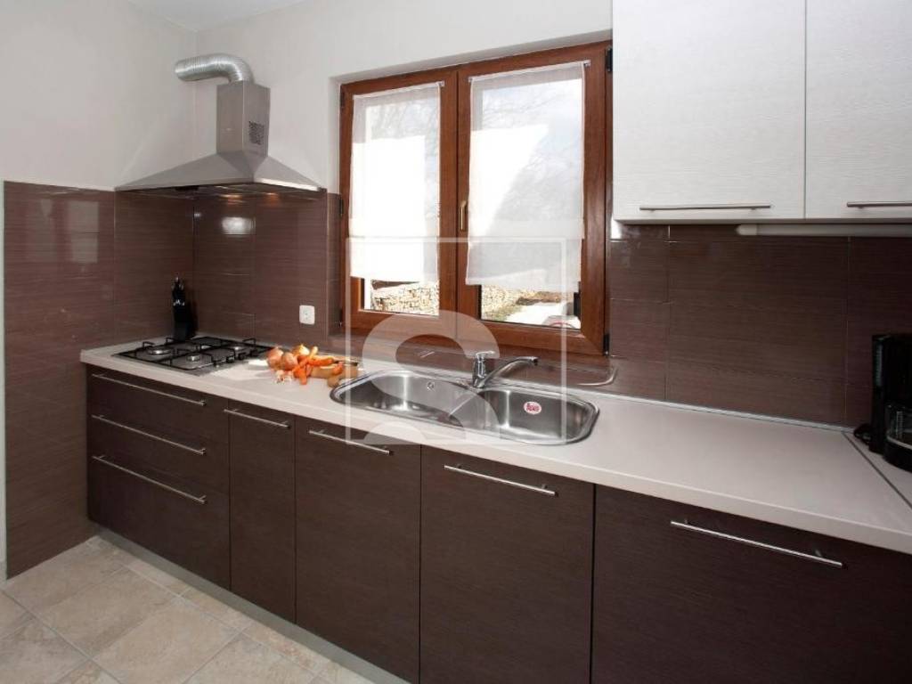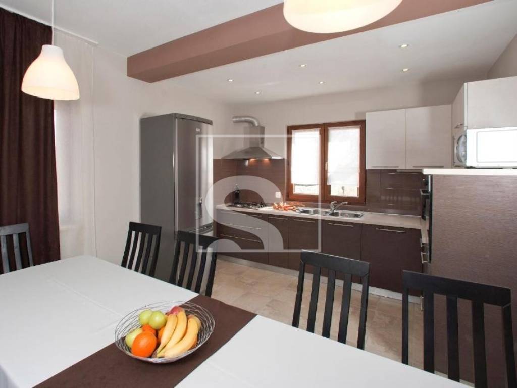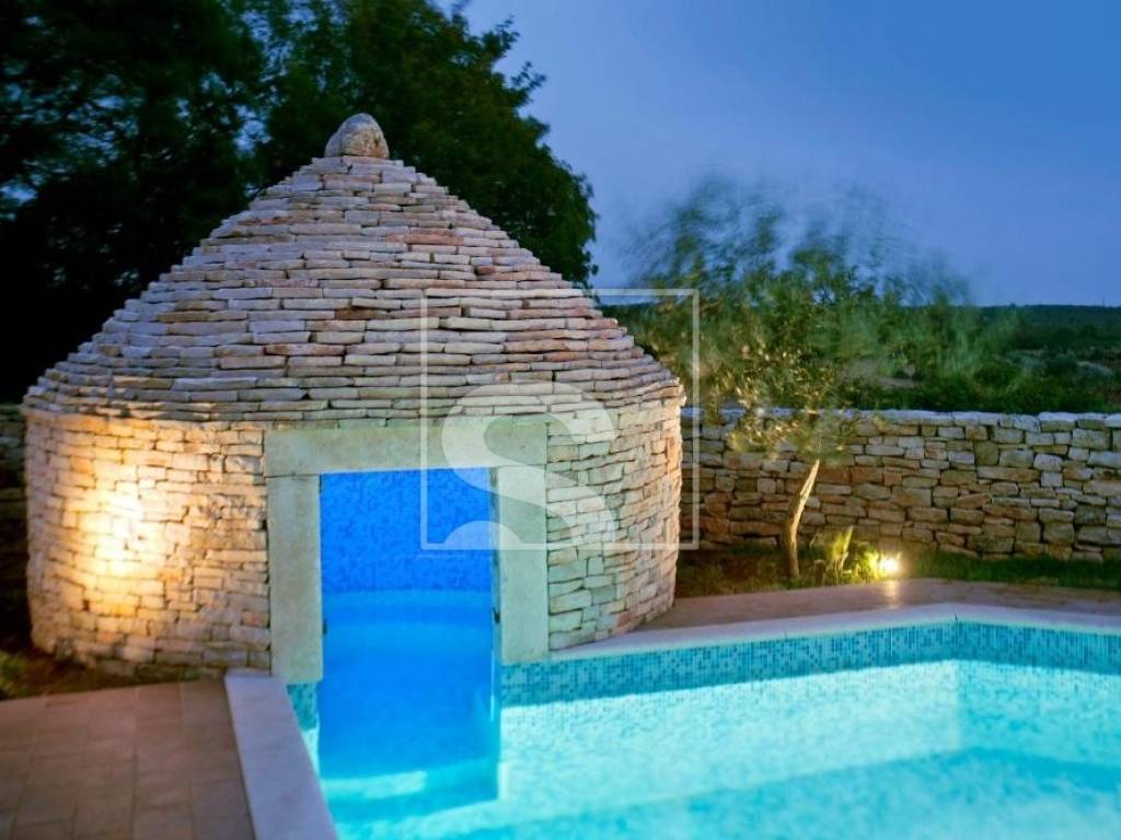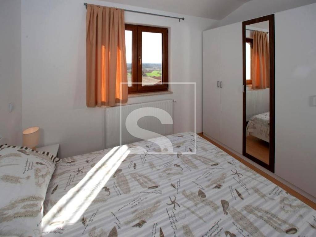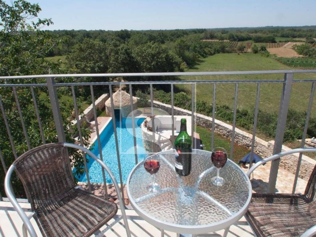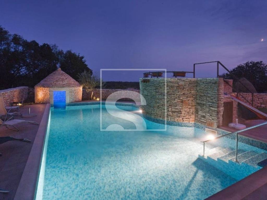 Svega par kilometra udaljeno od centra smjestila se ova moderna kuća s bazenom. Kuća je smještena na mirnoj lokaciji okružena kućama za odmor i obiteljskim kućama. Proteže se kroz četiri etaže, podrum, prizemlje, prvog kata i mansarde. U prizemlju se nalazi kuhinja s blagovaonicom, prostrani dnevni boravak, kupaona, spremište te natkrivena terasa s kaminom. Na katu su 5 spavaćih soba sa svojim kupaonicama te terasa s koje se pruža pogled na bazen, more i zelenilo prepuno livadama i šumama. Iz dnevnog boravka je izlaz na natkrivenu terasu i vrt gdje se nalazi bazen od 53 m². U sklopu bazena je predivan istarski kažun.