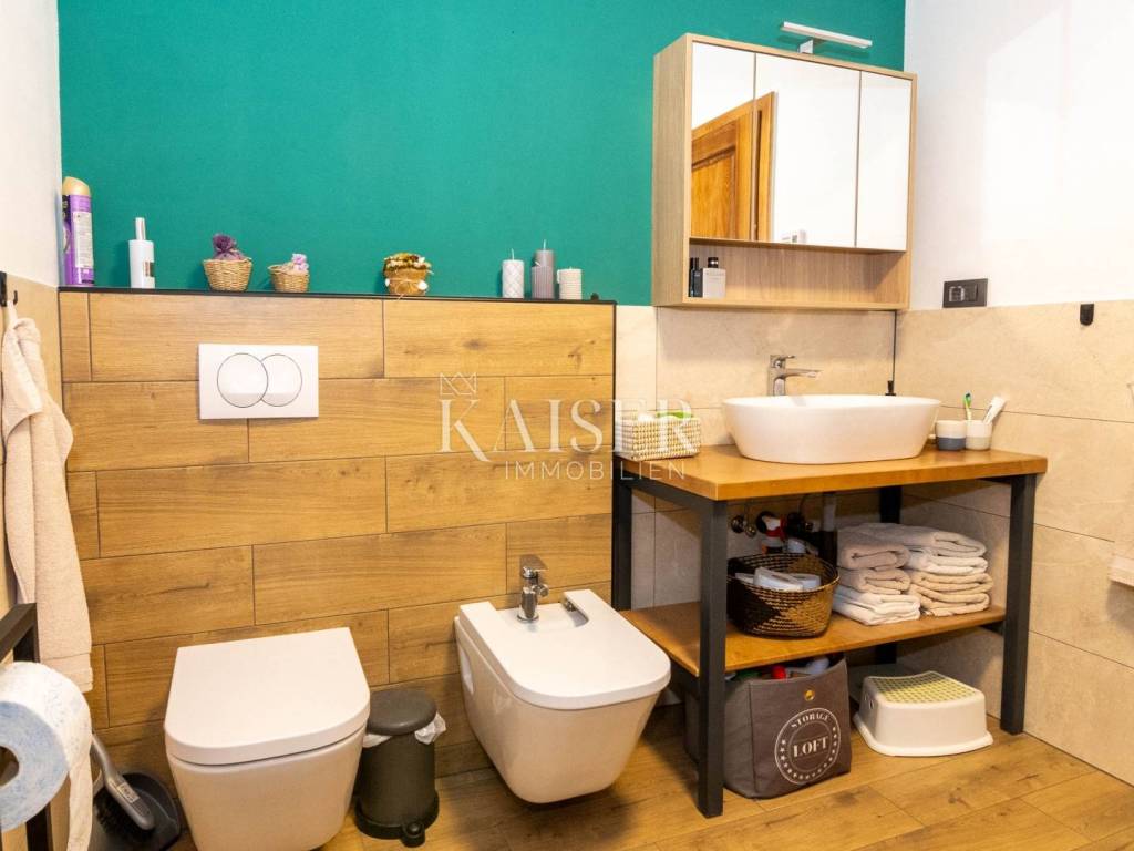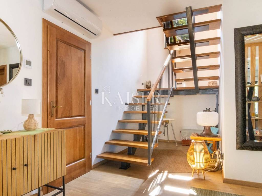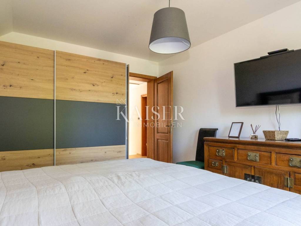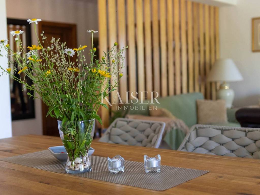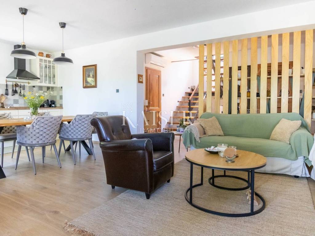 Interijer je uređen s puno ukusa, u toplim i neutralnim tonovima, uz korištenje kvalitetnih prirodnih materijala koji prostoru daju osjećaj elegancije, topline i domaće atmosfere.