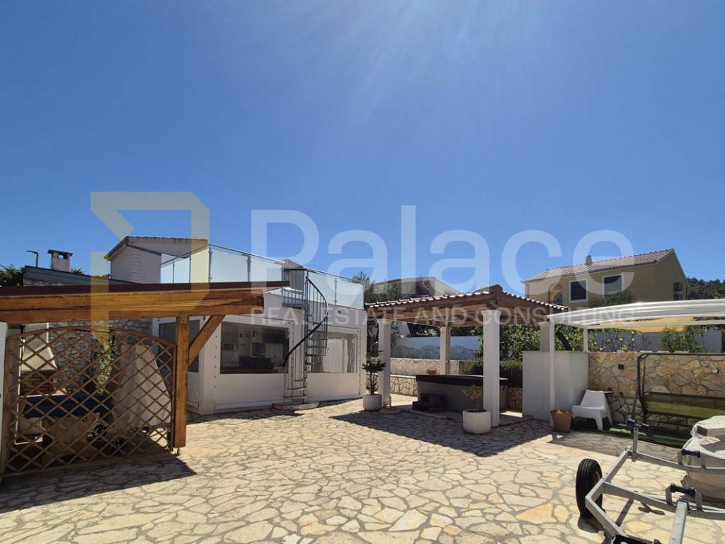 Oko kuće se nalazi prostrani bazen, tri vanjske kuhinje, ograđeni prostor za sunčanje s ležaljkama, jacuzzi, vanjski WC, spremište te brojni drugi sadržaji. Nekretnina je ograđena visokim zidovima koji omogućuju neometano uživanje u privatnosti vlastitog doma. Zahvaljujući svojoj orijentiranosti kuća obiluje prirodnim svijetlom, a do prve plaže ju dijeli samo par minuta hoda.